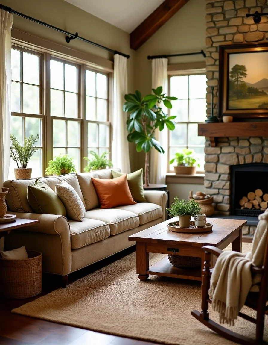 The living room embodies a cozy country style, featuring a warm earthy color palette of browns, greens, and soft cream tones. A large, plush, floral-patterned sofa, upholstered in rustic beige fabric, sits centrally, adorned with a mix of textured throw pillows in various shades of deep olive and rusty orange. Opposite the sofa, a reclaimed wood coffee table with a distressed finish anchors the space, surrounded by two antique wooden rocking chairs that encourage relaxed conversations. Natural light floods in through large windows fitted with sheer white curtains, illuminating rustic decor elements: a woven basket filled with throws, potted ferns decorating the window sills, and a hand-painted landscape artwork above a stone fireplace. Finally, a braided jute area rug in warm natural hues brings the room together, enhancing the earthy ambiance while providing a sensation of comfort underfoot.