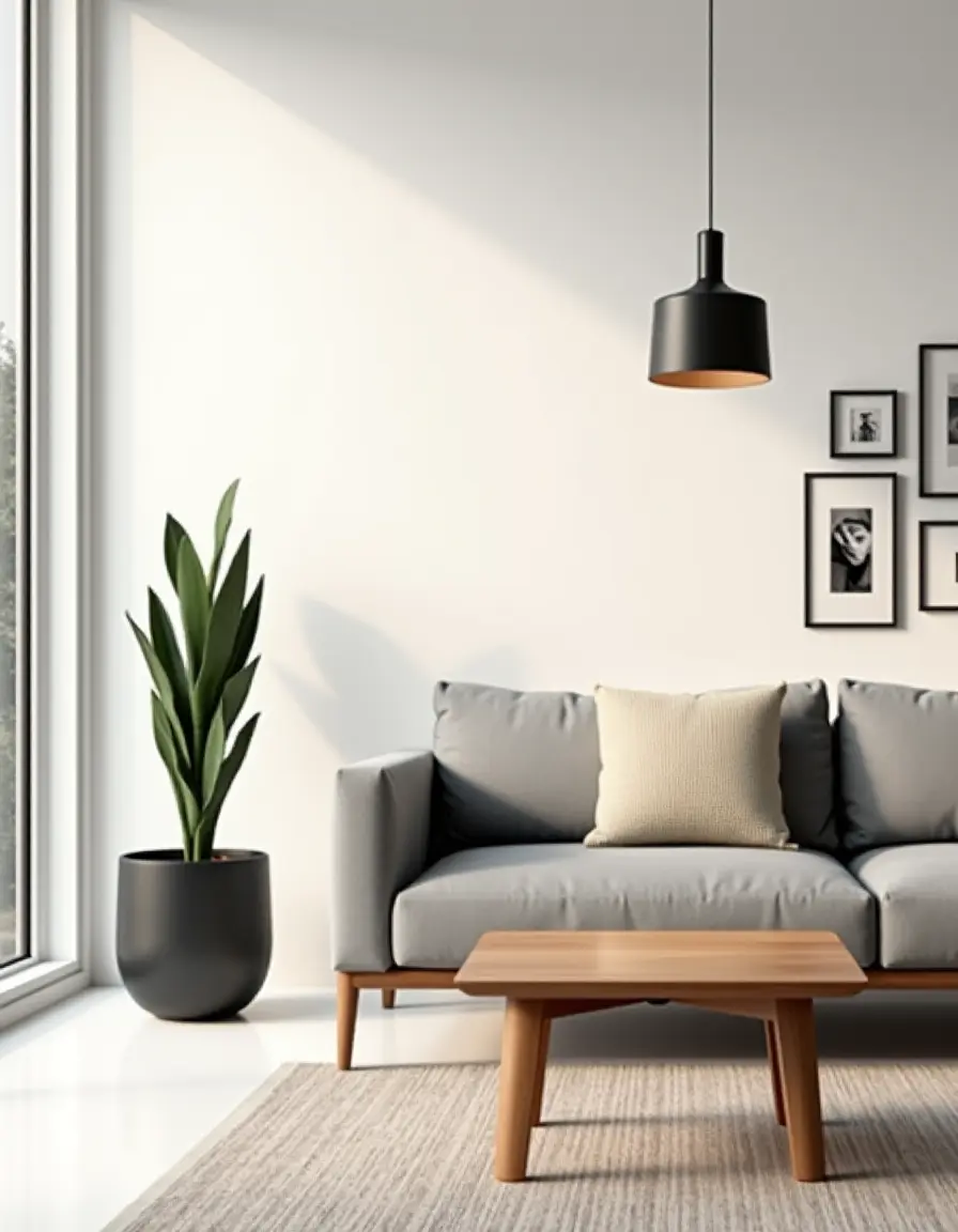 This minimalist living room embodies a serene ambience through its harmonious use of neutral colors such as soft whites, cool grays, and earthy taupes. Central to the space is a sleek, low-profile sofa in a muted gray fabric, adorned with two simple, textured throw pillows in shades of cream and beige, arranged against a backdrop of a large, frameless window allowing natural light to stream in, enhancing the spaciousness. A lightweight, rectangular coffee table crafted from polished natural wood with slender legs sits effortlessly in front of the sofa, while a solitary potted snake plant in a matte black ceramic pot adds a touch of greenery without overcrowding the space. The walls are adorned with a few strategically placed black-and-white photographs in simple frames, complementing the negative space and visual clarity, while a single, geometric pendant light provides soft illumination from above, completing the tranquil and thoughtfully curated atmosphere.