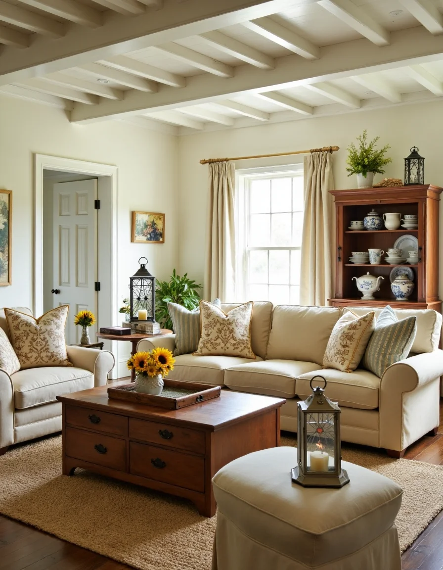 The living room exudes a warm, country charm with its whitewashed wooden beams running across the ceiling, enhancing the rustic feel. A large, comfortable sectional sofa draped in soft, strap-like beige slipcovers is placed at the center, surrounded by splashes of vibrant embroidered throw pillows featuring floral designs. On one side, a vintage oak coffee table bears signs of its age, adorned with a small vase of sunflowers and a worn-out leather-bound book. An antique china cabinet against the far wall displays delicate porcelain tea sets alongside quaint knick-knacks, while a braided jute rug anchors the seating area creating an inviting atmosphere. Soft light emanates from a pair of wrought iron lanterns hanging above, casting a warm glow over distressed cream-painted side tables that hold rustic lanterns and candles, completing the idyllic country ambiance.