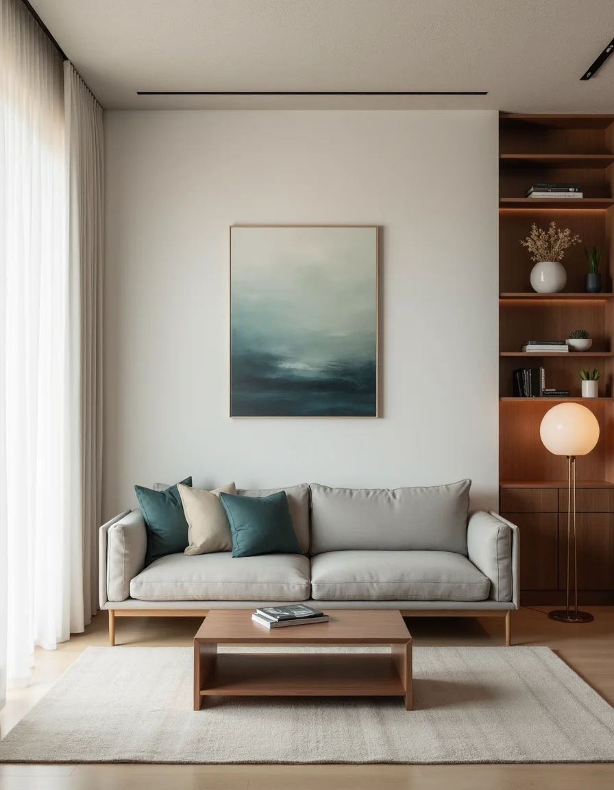 The living room showcases a stunning minimalist design characterized by a harmonious blend of functionality and negative space. A sleek, low-profile sofa in soft gray fabric stands as the central focus, positioned against a pale-white accent wall adorned with a single abstract painting featuring muted blues and greens. Opposite the sofa, a simple yet elegant low-profile walnut coffee table creates a natural gathering spot while maintaining a clear, open atmosphere. To the left, a minimalist bookshelf features floating wooden shelves adorned with a few carefully selected decorative items, evoking a sense of calm and simplicity. The overall ambiance is further enhanced by ample natural light streaming through sheer white curtains draping from textured ceiling to floor, while a single, sculptural floor lamp casts a warm glow in the evenings, inviting comfort without clutter.