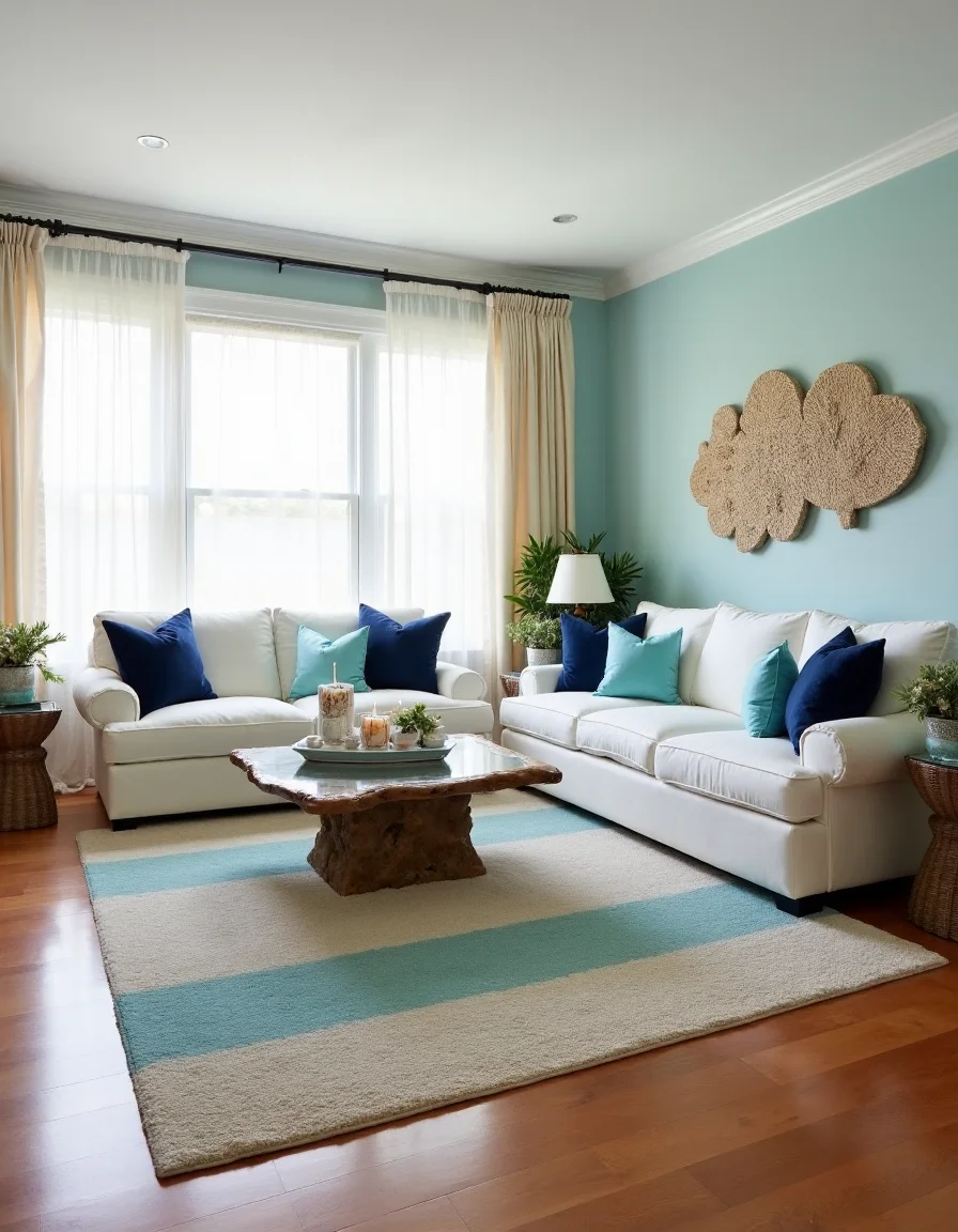 The living room exudes a refreshing seaside ambiance, anchored by a large, soft-striped area rug in shades of sandy beige and ocean blue that sprawls across the polished hardwood floor. A pair of oversized, plush white sofas take center stage, adorned with navy and turquoise accent pillows that mirror the hues of the coastal waves. To the left, a driftwood coffee table with a glass top serves as a stunning focal point, showcasing a centerpiece of seashells and candles in fragile glass holders. A light, airy atmosphere fills the room with billowing white sheer curtains hanging from seagrass-woven rods, and a coral-formed wall art piece on the adjoining wall subtly echoes the natural flow of the ocean, completing the tranquil seaside retreat vibe.