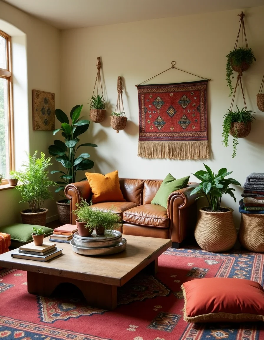 The living room embodies a cozy bohemian aesthetic, with a rich tapestry of colors and textures that create an inviting atmosphere. A large, vintage Persian area rug in deep reds and antique golds anchors the room, while an eclectic mix of furniture includes a reclaimed wood coffee table adorned with succulent plants and vintage books. Plush, floor cushions in vibrant greens, burnt oranges, and earthy browns are scattered around the low seating, including an oversized, comfortably worn leather armchair. Ethnic wall hangings made from woven textiles feature prominently against soft cream walls, alongside macramé plant hangers showcasing lush green ferns. Multiple rattan baskets filled with assorted throw blankets add a touch of warmth and organization, completing a space that celebrates unique global influences and laid-back charm.