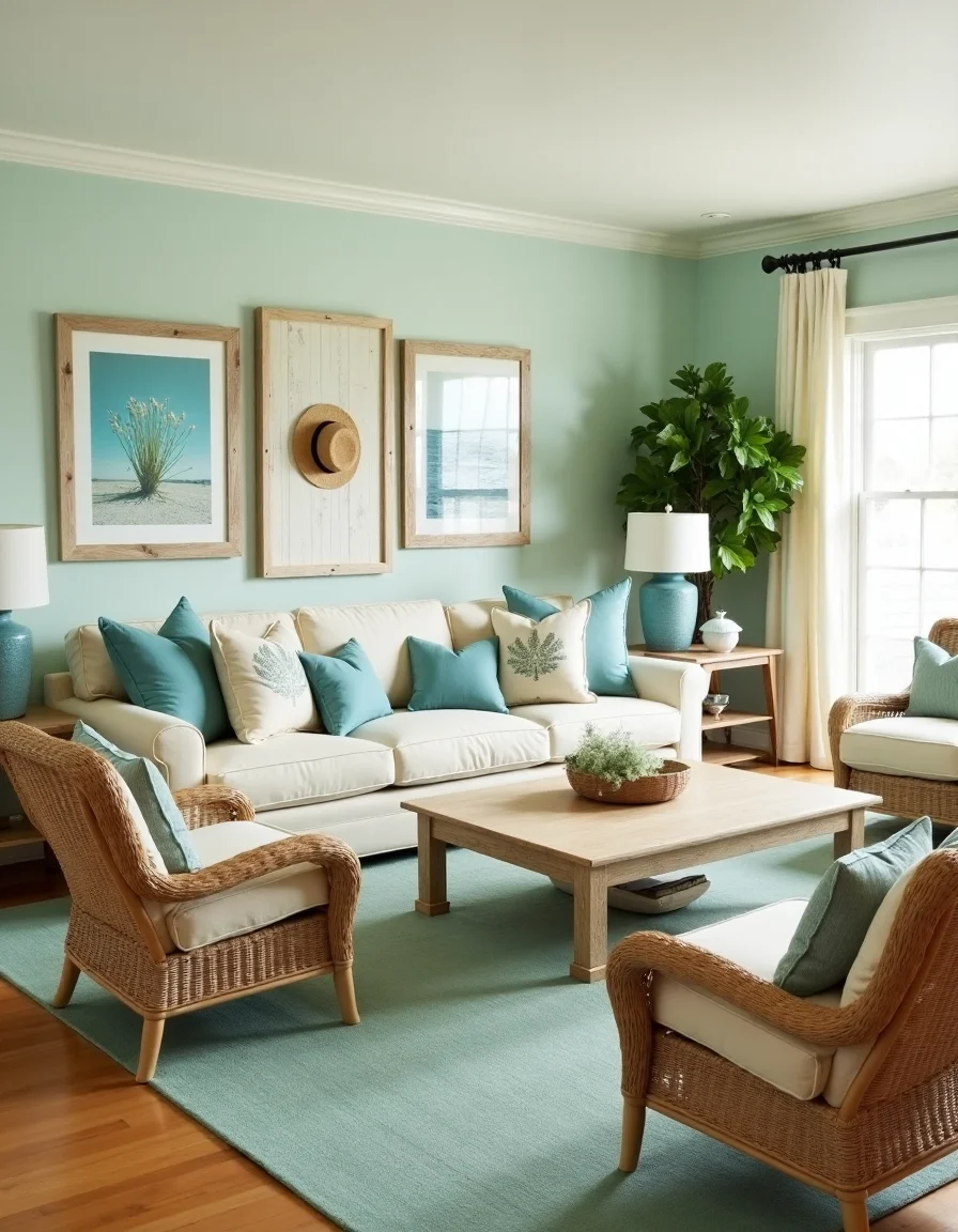 The living room is infused with a calming seaside atmosphere, dominated by soft beige shades that mimic sandy shores. A large, plush sectional sofa upholstered in light cream fabric is centrally placed, adorned with decorative pillows in various ocean-inspired prints featuring corals and seashells. Surrounding the area, natural wicker furniture—two rattan chairs and a matching coffee table topped with driftwood—adds texture and warmth, while a large seafoam green rug anchored beneath invites barefoot comfort. The walls, painted in a pale aqua, feature artful nautical photographs framed in whitewashed barn wood, and decorative touches like a jar of sea glass and a straw beach hat are thoughtfully placed around the room for cohesive beach decor.