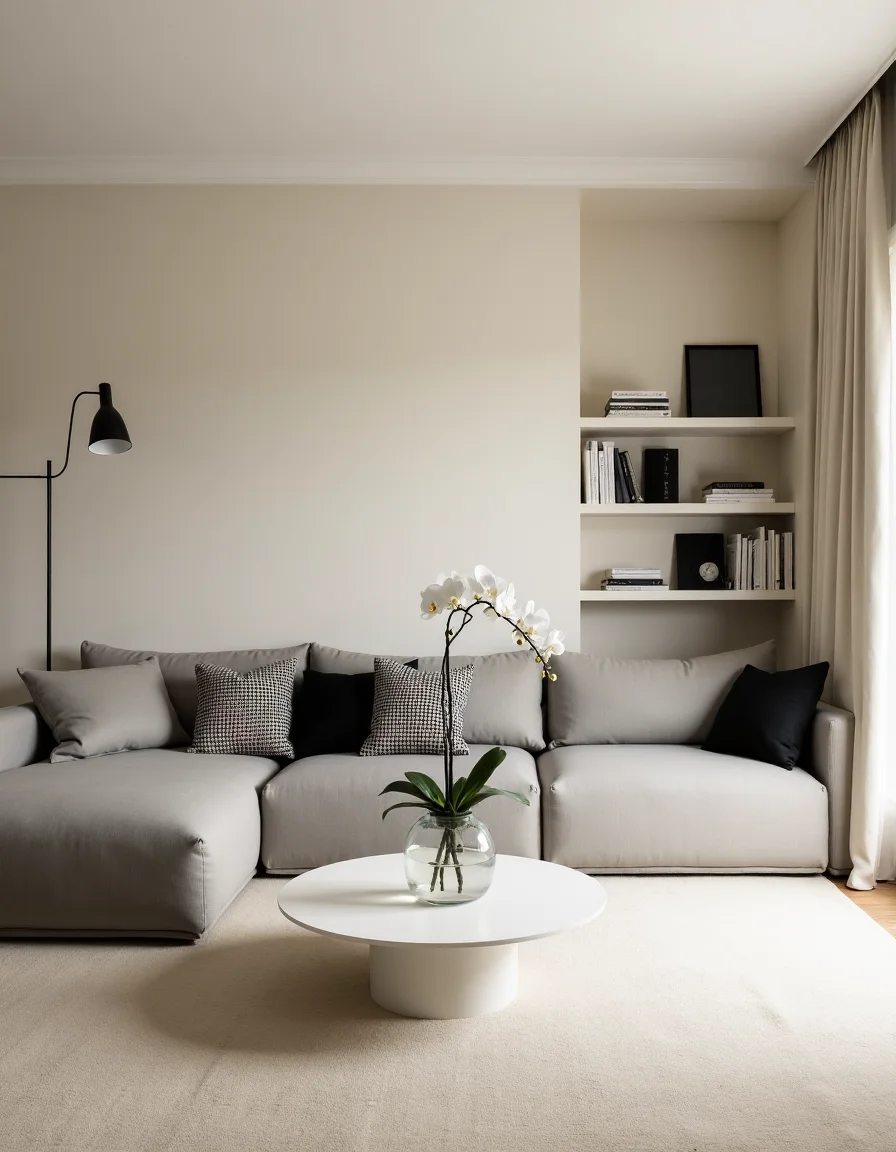 The living room is a serene sanctuary featuring a minimalist style, with clean lines and an uncluttered design. A large, soft gray sectional sofa is centered against the wall, adorned with a few monochrome geometric-patterned throw pillows in black and white for subtle visual interest. Across from the sofa, a sleek white coffee table with a matte finish displays an elegant glass vase filled with a single faux white orchid. The room is softly illuminated by a pair of modern floor lamps with thin, black metal frames, casting a gentle glow on the light beige walls, and a plush cream area rug anchors the seating area while adding warmth to the space. Strategically placed custom-built shelves showcase a sparse collection of monochromatic art books and minimalist decor items, enhancing the overall harmony and tranquility of the room.