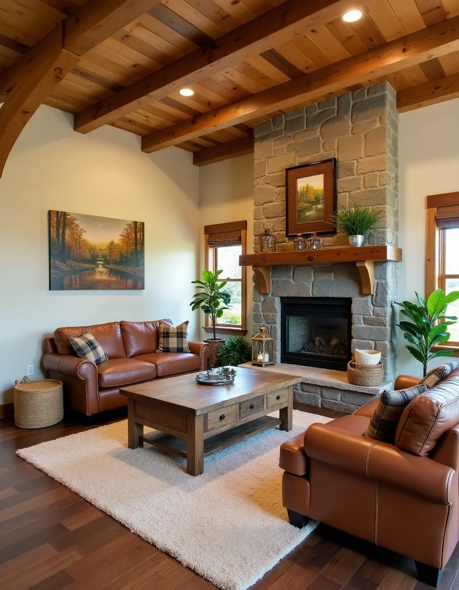 This charming rustic living room features warm, exposed wooden beams traversing the high ceiling, creating a cozy atmosphere that invites relaxation. The walls are a soft beige color, contrasting beautifully with the rich, dark walnut hardwood flooring. In the center, a large, weathered oak coffee table sits atop a plush, cream-colored area rug, flanked by a pair of deep-seated, distressed leather sofas in a warm chestnut hue. Along one wall, a striking stone fireplace serves as the room's focal point, adorned with handcrafted wooden mantels and rustic decorations like vintage lanterns and woven baskets, while potted greenery adds a hint of freshness. The space is accentuated with plaid throw pillows, rustic wall art depicting nature scenes, and a woven jute pouf positioned casually in the corner for added texture and functionality.