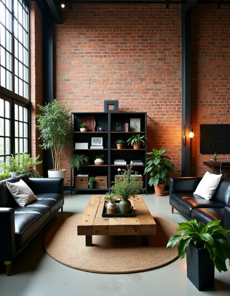 This stunning industrial-style living room features towering ceiling windows that flood the space with natural light, accentuating the exposed brick walls which showcase a rustic charm. Centered in the room is a solid reclaimed wooden coffee table with a slight weathered finish, surrounded by several black leather sofas with soft cushions providing a pop of comfort against the rougher textures. A large metal bookshelf stands against one wall, home to a curated selection of plants and books, while decorative accents like a vintage floor lamp with an Edison bulb or abstract metal wall art enhance the industrial vibe. The concrete flooring is softened by a large woven jute rug, and lush planters filled with greenery provide a touch of warmth, balancing the raw aesthetics of the space.