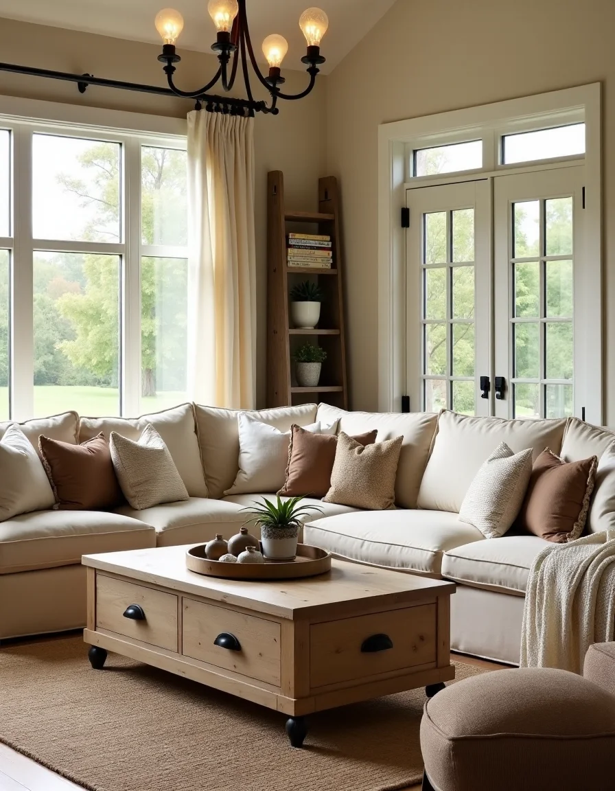 The living room boasts a cozy country charm, anchored by soft beige walls that create a warm, inviting backdrop. A large, overstuffed cream-colored sectional sofa is adorned with an array of textured throw pillows in muted earth tones, creating a sense of comfort and informality. A rustic wooden coffee table, distressed in a charming light oak finish, sits centrally, surrounded by a plush jute area rug that adds additional warmth underfoot. To enhance the farmhouse ambiance, there's a vintage ladder shelf in the corner, showcasing potted greenery, handmade ceramics, and weathered books. Soft, cascading sheer curtains frame the large windows, filtering light and revealing a picturesque view of the surrounding nature, while a wrought-iron chandelier with soft, warm bulbs hangs enticingly from the ceiling, completing the tranquil setting.