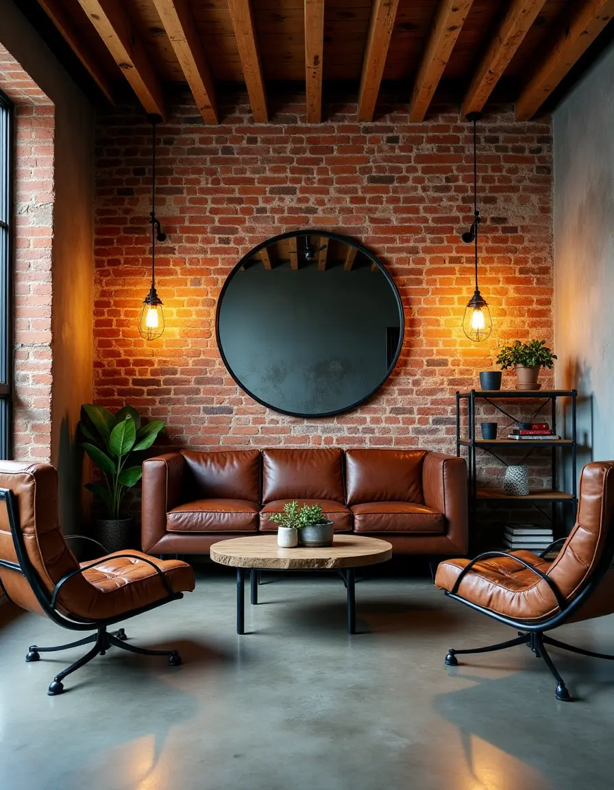 The living room embodies a rugged industrial style, featuring a striking exposed brick wall with a burnt red tone that contrasts beautifully against the cool gray of the polished concrete floor. A large, dark brown leather sofa, distressed for character, sits centrally arranged with a collection of mismatched vintage leather and metal accent chairs flanking either side. Above the sofa, an oversized metal-framed mirror hangs, reflecting the ambient light from reclaimed wood ceiling beams. A rustic wooden coffee table, with an iron base and a weathered finish, anchors the seating area, while a few industrial-style pendant lights dangle from the ceiling, illuminating the space with a warm, inviting glow. To add a touch of personality, a collection of potted succulents and vintage books is artfully arranged on a nearby metal shelving unit, providing a balance of nature against the raw industrial backdrop.