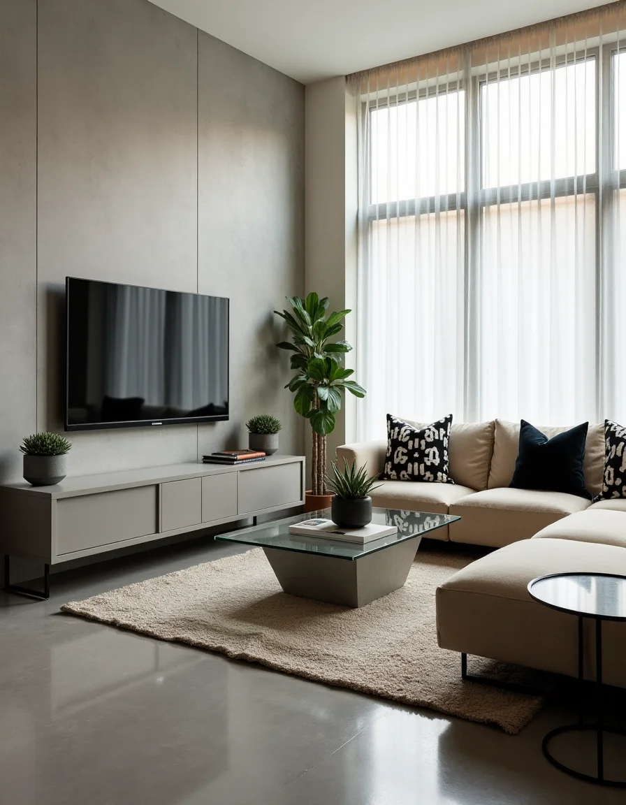 This modern living room features a sleek and minimalist design, dominated by a soft gray concrete feature wall that serves as a backdrop for a large flat-screen TV mounted above a low-profile, glass-front media console. The cozy seating area is anchored by a plush, low-backed sectional sofa in a neutral beige fabric, adorned with bold, abstract black-and-white throw pillows that add a touch of artistry. A minimalist coffee table, constructed of clear tempered glass atop a geometric concrete base, sits centrally, accompanied by stylish black metal side tables on either side, adorned with potted succulents that bring a hint of greenery to the space. Floor-to-ceiling windows dressed in sheer white drapery flood the room with natural light, while a textured area rug in muted tones of charcoal and cream lies beneath, providing warmth and tactile contrast to the polished concrete floor.