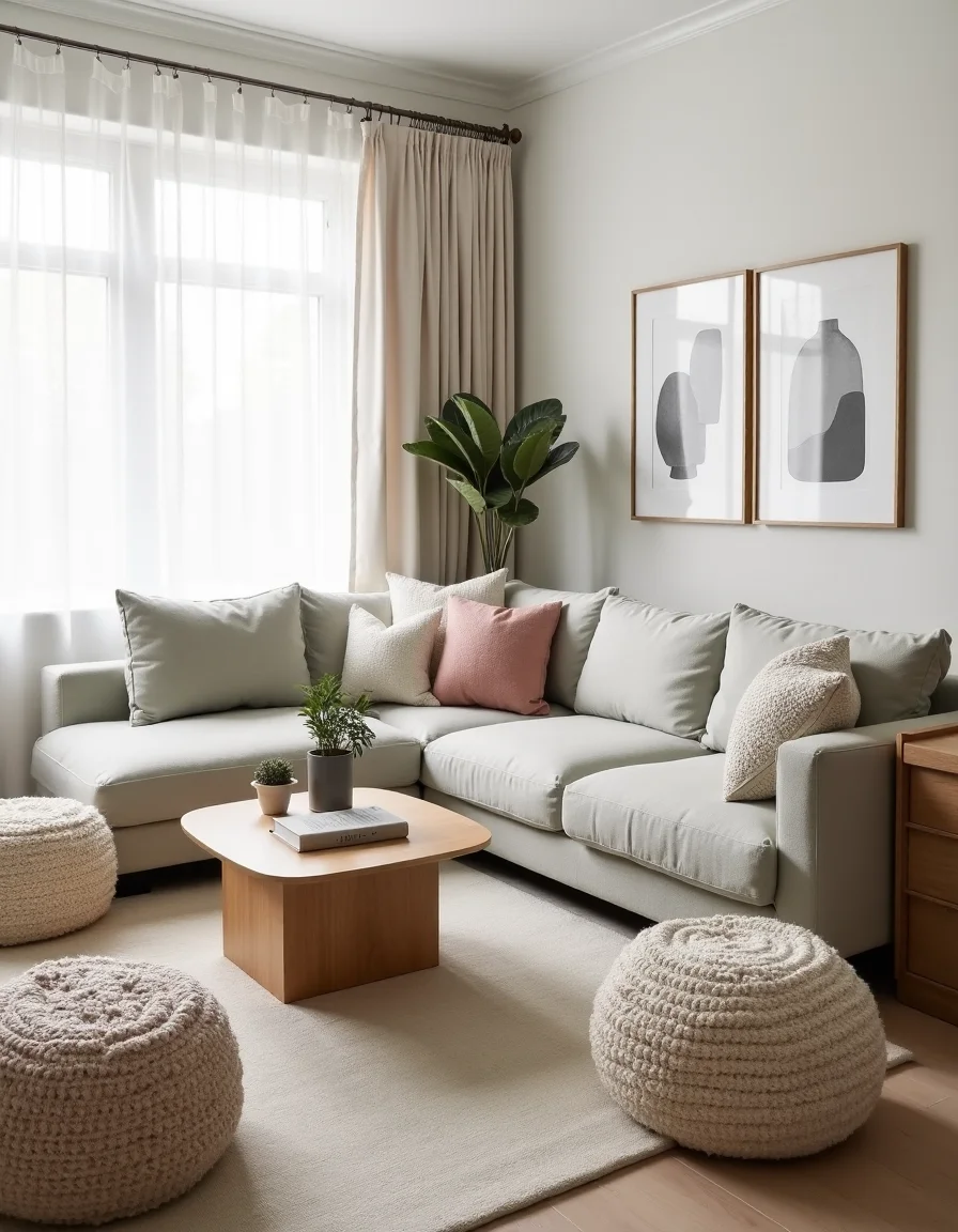 This Scandinavian-style living room exudes warmth and serenity, featuring a light, airy color palette dominated by soft whites and muted pastels like gentle mint and blush pink. The space is anchored by a plush, light gray sectional sofa adorned with an assortment of textured throw pillows in organic fabrics, creating a cozy yet modern feel. A minimalist oak coffee table sits at the center, showcasing a small potted succulent and an open book, while woven knit poufs in creamy tones provide additional seating around the room. Floor-to-ceiling sheer curtains frame large windows, allowing natural light to flood the space, complemented by a light wood accent console topped with artisanal ceramics and framed black and white photography that brings character to the otherwise sleek and uncluttered aesthetic.