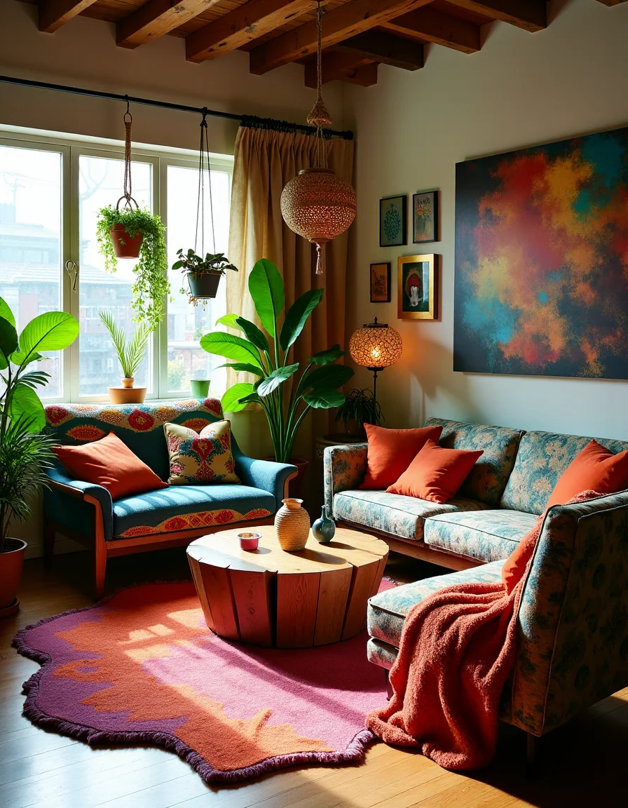 The living room exudes a vibrant bohemian style, filled with an eclectic mix of textures and colors that create a warm and inviting atmosphere. A plush, oversized, tie-dye area rug sprawls across the hardwood floor, while mismatched vintage sofas adorned with colorful patterned cushions are arranged in a cozy semi-circle around a low, round wooden coffee table made from reclaimed wood. Natural greenery thrives within the space, with lush potted plants cascading from hanging macramé holders near the window where sunlight pours in, illuminating the large, abstract paintings on the walls that add bursts of color and whimsy. A tapestry in rich earth tones drapes over one corner, complementing a gallery wall filled with an assortment of framed photographs and art prints, while eclectic lanterns and candles scattered around enhance the ethereal ambiance. To finish off the look, a vibrant woven throw blanket is draped casually over the edge of a sofa, inviting relaxation in this artistic haven.