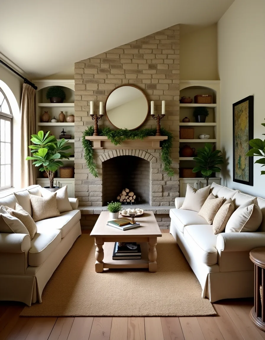 This charming country-style living room exudes warmth and comfort, adorned with soft neutrals that harmonize beautifully with rustic elements. A large, distressed wooden coffee table sits centrally, surrounded by a cozy arrangement of beige and cream-colored upholstered sofas decorated with floral-patterned throw cushions. The highlight of the room features a grand stone fireplace with a sturdy wooden mantle, draped in ivy-green garland and framed by woven baskets and candle holders. To one side, a tall white-painted bookshelf showcases an array of handmade pottery and vintage books, punctuated by lush potted plants that add a touch of nature. Soft, textured area rugs in warm taupe hues define your lounging space, while breezy linen curtains softly filter the sunlight pouring in through the large, mullioned windows, creating an inviting atmosphere throughout the room.