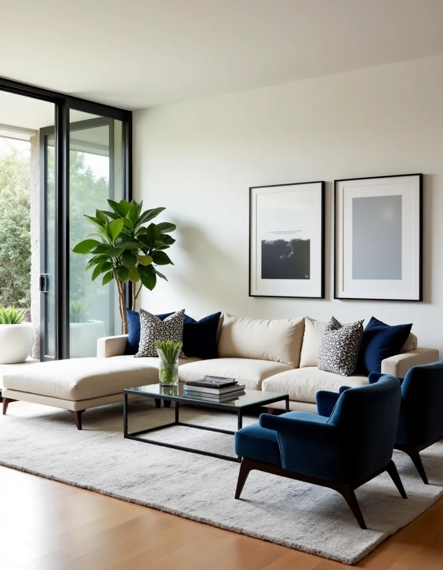 This modern living room boasts an open and airy layout, defined by floor-to-ceiling glass windows that flood the space with natural light. The main feature is a sleek, low-profile beige sectional sofa adorned with contrasting black and white geometric-patterned throw pillows, positioned centrally to create a cozy conversation area. A minimalist glass coffee table rests atop a plush area rug in soft greys, centered between the sofa and a pair of mid-century modern lounge chairs in striking navy blue upholstery, adding a pop of color. The walls are painted in a soft, matte white, featuring minimalist art pieces framed in black, while a single green plant radiates vibrancy, placed in a modern ceramic planter at one corner to infuse a touch of nature into the contemporary design.
