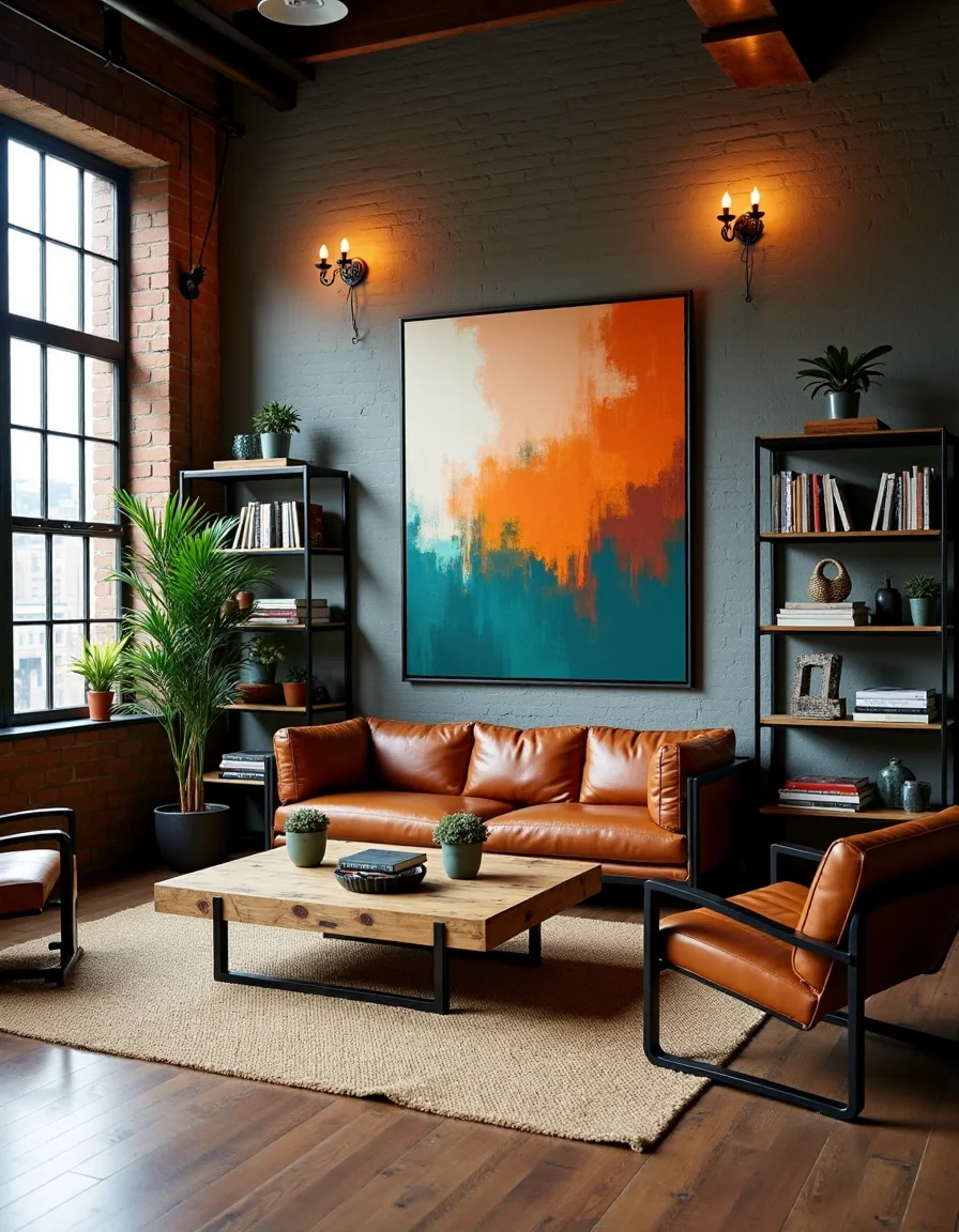 This industrial-style living room exudes a raw and edgy atmosphere, characterized by exposed brick walls painted in a charcoal gray and large metal-framed windows that allow natural light to flood the space. A plush brown leather sofa is placed in the center, paired with two minimalist black metal chairs featuring reclaimed wood accents, creating a cozy seating area around a large, weathered oak coffee table. Against one wall, tall iron shelves are mounted, showcasing an assortment of books, vintage decor, and potted succulents with industrial-style planters. For added warmth and character, a woven jute rug grounds the space, while a bold abstract artwork with splashes of orange and teal hangs above the sofa, pulling together the room's color scheme with a contemporary flair.