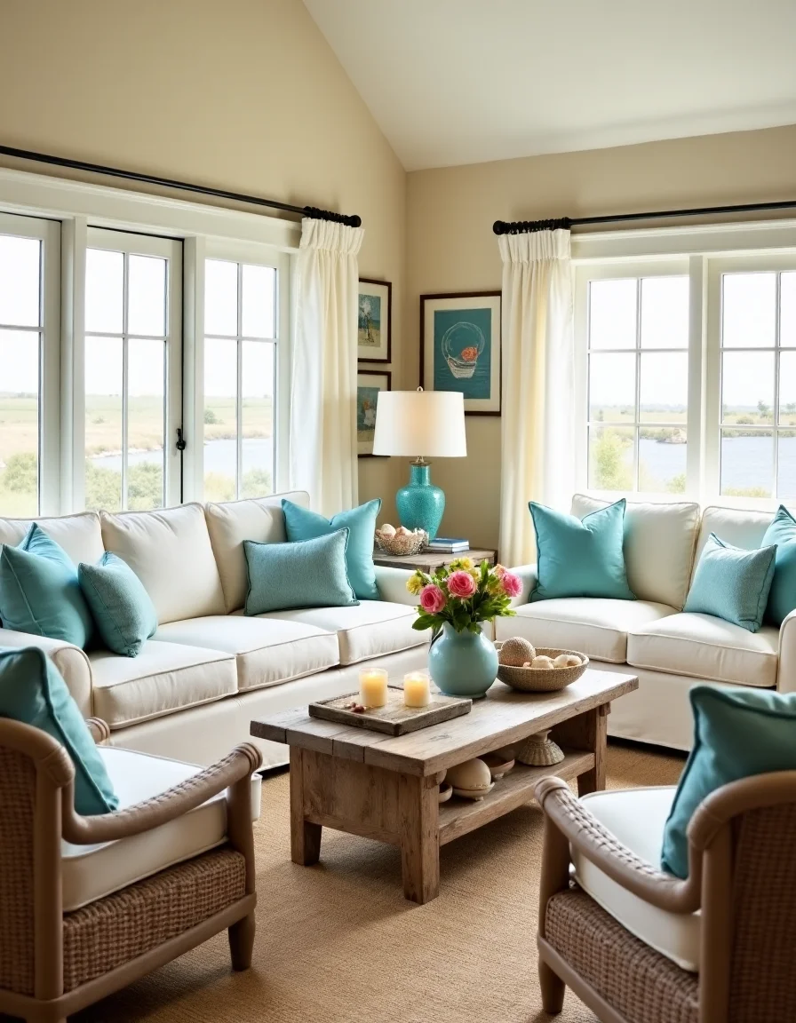 The living room embodies a charming seaside aesthetic characterized by casual decor and a serene palette. Dominating the space is a plush, white slipcovered couch adorned with soft azure throw pillows, inviting relaxation. A natural jute rug lies underneath, its earthy texture contrasting beautifully with the light beige shades of the walls, which evoke the calming hues of sandy beaches. Flanking the couch are two wicker armchairs with pastel blue cushions, while a driftwood coffee table, slightly weathered, sits at the center, adorned with a vase of fresh seashells and a few tealight candles. The room is illuminated by large, airy windows dressed with sheer white curtains, with nautical artwork displayed on the walls, enhancing the beach-inspired ambiance.