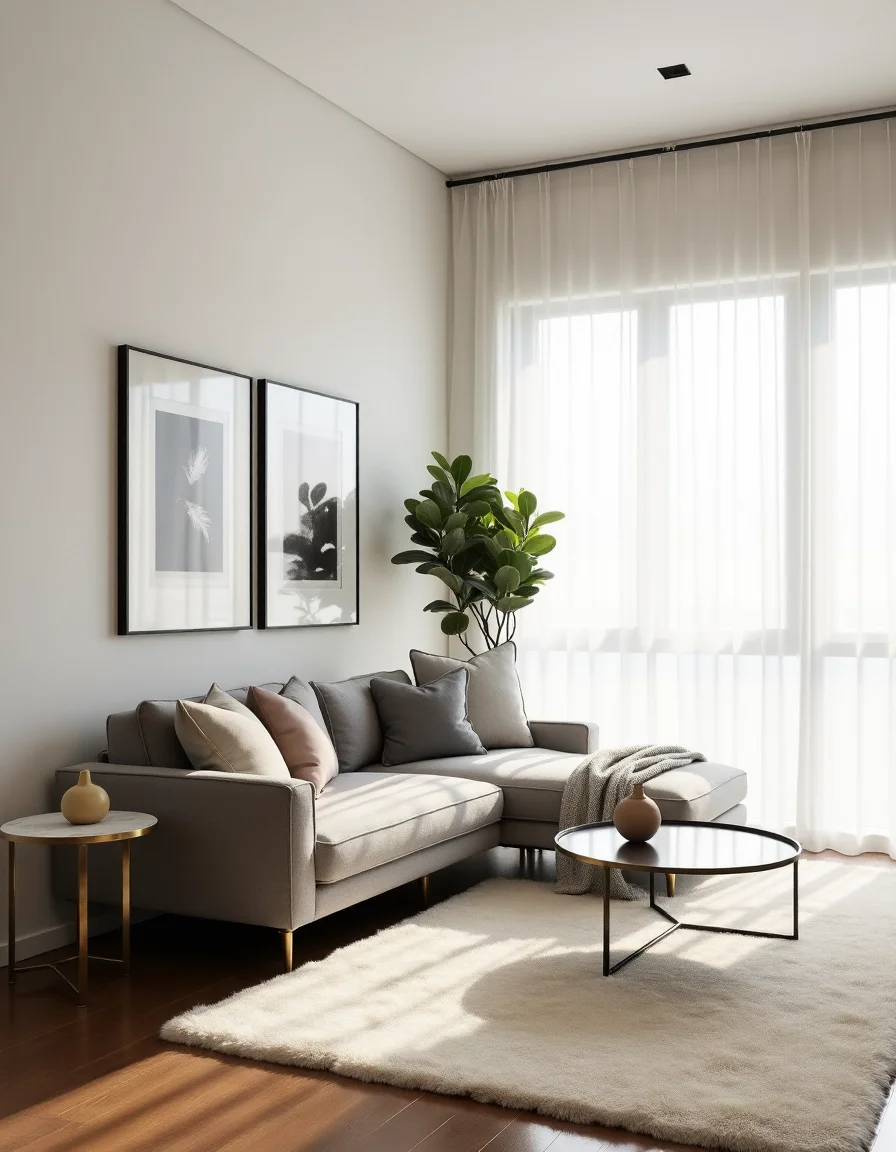 The living room showcases a minimalist design that harmonizes simplicity with subtle sophistication. A sleek, low-profile grey sectional sofa dominates the space, paired with a glass-topped coffee table featuring a slim brass frame, set centrally on a large, plush cream area rug. On the wall, there are two framed monochrome abstract paintings that add a touch of artistic flair without overwhelming the senses. The room is accentuated by a tall, leafy potted plant placed in one corner, while a small, circular side table beside the sofa holds a single minimalist ceramic vase, embodying the ethos of less is more. Soft natural light filters in through sheer white curtains, enhancing the overall serene and open atmosphere of the room.