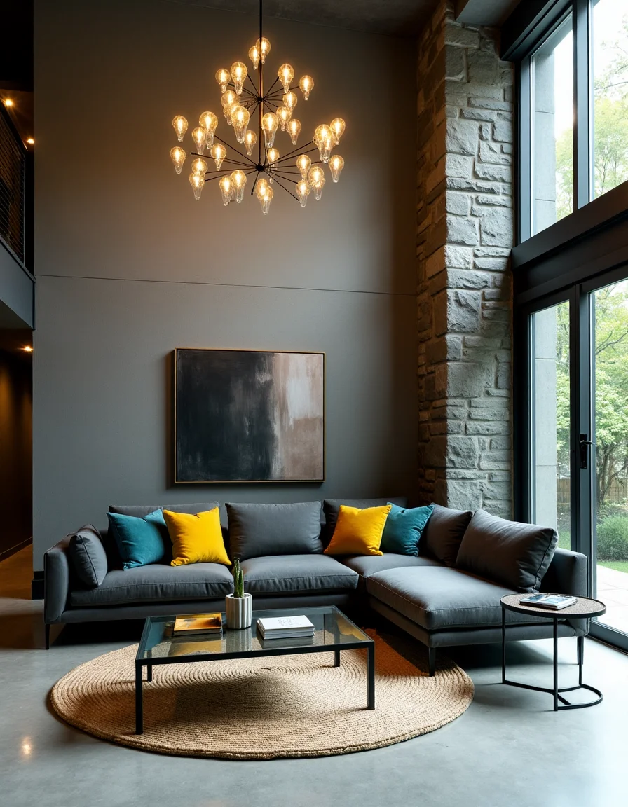This stunning modern living room combines industrial aesthetics with sophisticated elegance. The flooring is a sleek polished concrete, while the walls are a mix of exposed dark stone and crisp white glass panels that reflect natural light beautifully. Centered in the space is a large sectional sofa in a deep charcoal fabric, adorned with vibrant mustard-yellow and teal throw pillows for a pop of color. A rectangular glass coffee table rests on a complementary woven area rug in natural tones, flanked by minimalist black metal side tables. The room is illuminated by a striking geometric chandelier made of brushed nickel and clear glass, enhancing the harmonious blend of textures.
