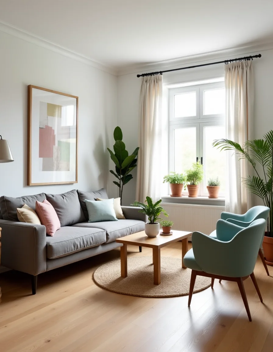 This Scandinavian-inspired living room boasts a bright and airy atmosphere, defined by its light wood floors and white walls that create an inviting backdrop. A cozy, oversized gray fabric sofa sits in the center, accented with soft pastel throw pillows in blush pink and mint green. A minimalist wooden coffee table with clean lines rests in front of the sofa, flanked by two sleek mid-century modern armchairs in a muted blue upholstery. Natural light floods the room through sheer linen curtains, illuminating a collection of indoor plants in terracotta pots placed strategically around the space. The decor is complemented by a woven jute rug underfoot, and abstract artwork hangs above the sofa, adding a splash of color and enhancing the modern yet practical vibe of the room.