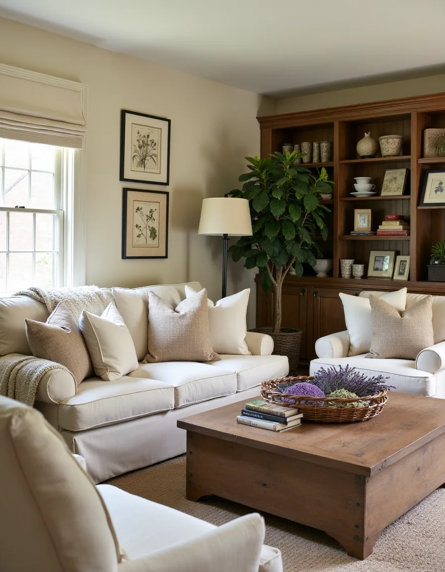The living room exudes a warm, inviting country charm with its soft neutrals dominating the color palette. A large distressed oak coffee table is at the center, adorned with a rustic wicker tray filled with dried lavender and a few well-loved books. Surrounding the table, a set of plush cream-colored slipcovered sofas, accented with hand-stitched throw pillows in muted earth tones, invite family gatherings. A handmade quilt drapes over the back of one sofa, while tall potted ferns and an antique floor lamp with a soft linen shade add to the cozy ambiance. For decoration, vintage framed botanical prints line the pale beige walls, and a large reclaimed wood bookshelf holds an array of knick-knacks and family photographs.