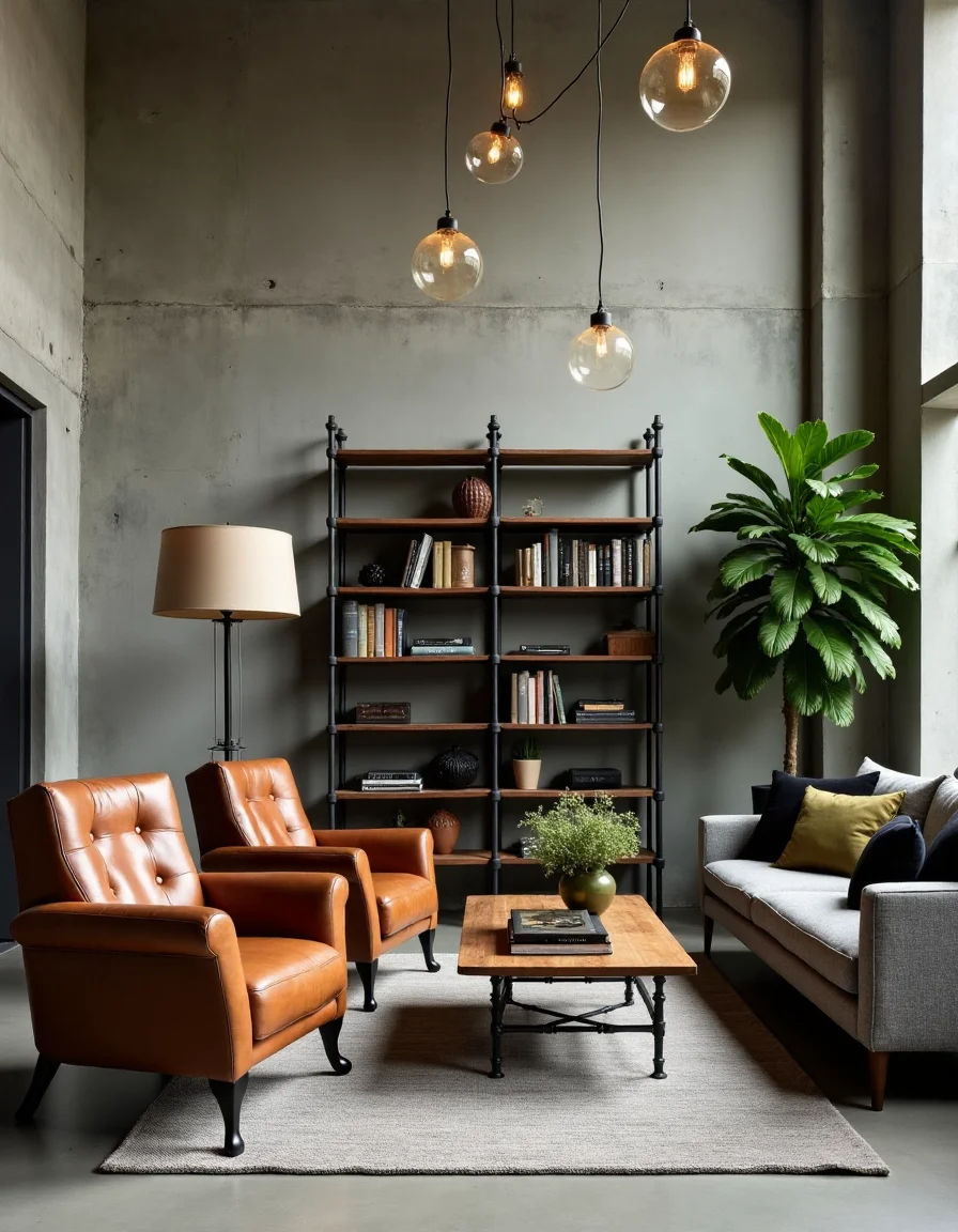 The living room showcases a striking industrial aesthetic characterized by exposed concrete walls that bear traces of their raw texture, providing a bold backdrop. Two large, tufted leather armchairs in a distressed brown tone are positioned near a reclaimed wooden coffee table, complete with metal accents, creating a juxtaposition of warmth and ruggedness. A floor lamp with an oversized, claw-foot design stands next to a textured gray sofa adorned with throw pillows in black and olive green. In one corner, a tall bookshelf crafted from repurposed steel pipes holds an array of books and decorative vases, while a lush indoor plant adds a touch of nature against the industrial backdrop. The space is illuminated by pendant lighting hung from the ceiling with visible wires, enhancing the raw, unfinished look of the room.