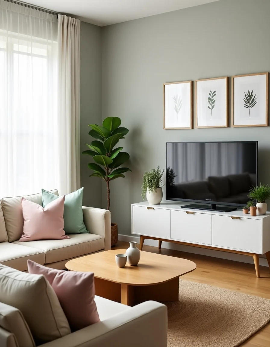 The living room exudes a serene Scandinavian aesthetic with its bright and airy ambiance. A large, soft beige sectional sofa is centrally placed, accented with pastel pink and mint green throw pillows that add subtle pops of color. In front of the sofa, a sleek, light oak coffee table features delicate brass accents, while a woven jute rug grounds the space beneath. Across from the sofa, a minimalist white media console showcases a curated selection of indoor plants and handmade pottery, complemented by natural light streaming in through sheer white curtains. The walls are painted in a soft dove gray, adorned with framed monochromatic nature prints, enhancing the calming atmosphere of this beautifully designed space.