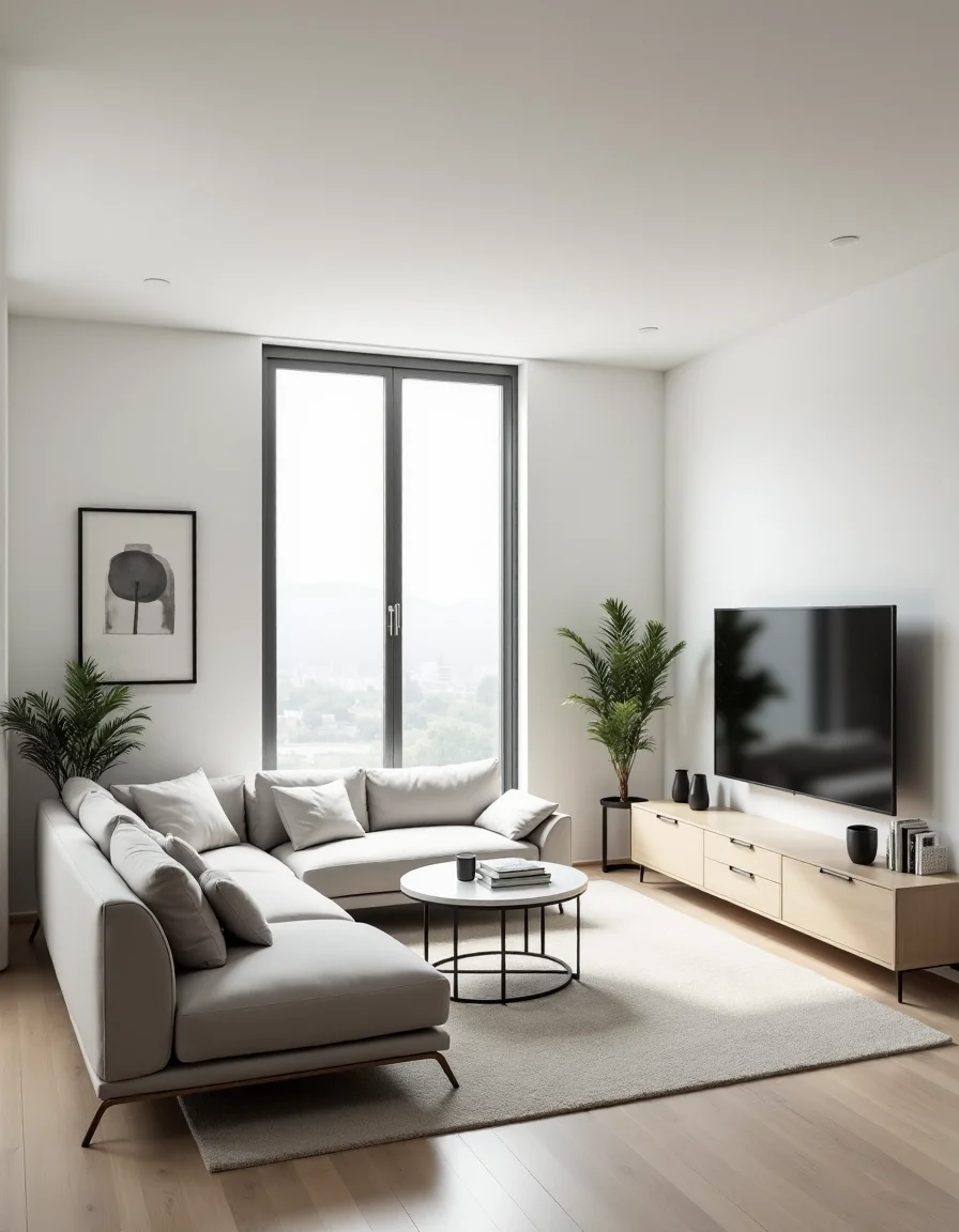 This minimalist living room features a soft palette of whites and greys, enhanced by simple yet functional furniture that emphasizes both comfort and efficiency. A sleek, light-grey sectional sofa is positioned in the center, accompanied by a round, glass coffee table that reflects natural light, further promoting the airy feel of the space. The walls are adorned with subtle, unframed monochromatic art pieces, and a large floor-to-ceiling window ensures an abundance of daylight, creating a serene atmosphere. An elegant, low-profile television console in white oak harmonizes with the room, while a few potted plants add a touch of freshness without overwhelming the clean lines of the design.