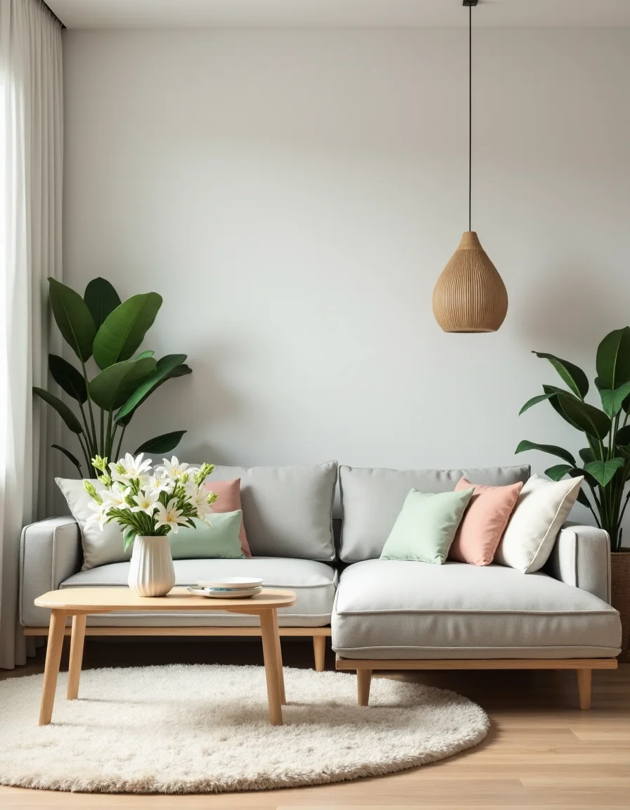 The living room is a serene oasis featuring a palette of pale tones, predominantly white and soft gray, accented with warm wood textures. A large, L-shaped soft gray sectional couch dominates the space, adorned with an array of pastel-colored throw pillows in muted blush and mint green shades. In front of the couch, a minimalist light oak coffee table with clean lines holds a vase of fresh white lilies, adding a touch of elegance. Scandinavian-inspired pendant lights hang from the ceiling, casting a gentle glow over the room, while a plush, ivory area rug anchors the seating area and provides comfort underfoot. Tall potted plants with lush green leaves sit strategically in the corners, infusing the room with life and complementing the functional yet cozy design aesthetic.