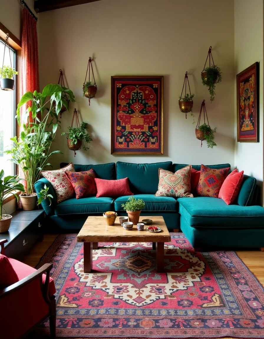 This vibrant bohemian living room is a feast for the senses, filled with rich textures and eclectic decor. A plush, overstuffed sectional sofa upholstered in a mix of deep teal and jewel-toned fabrics sprawls across the space, surrounded by an array of patterned throw pillows in various sizes, featuring floral and geometric motifs. In the center, a large, handwoven area rug with intricate tribal designs anchors the room, beneath a rustic wooden coffee table adorned with a collection of brass and ceramic coasters. An assortment of potted plants are interspersed around the room, hanging from macrame holders on the walls, while framed ethnic art and colorful, handmade tapestries adorn the walls, creating a warm and inviting atmosphere that brims with personality.