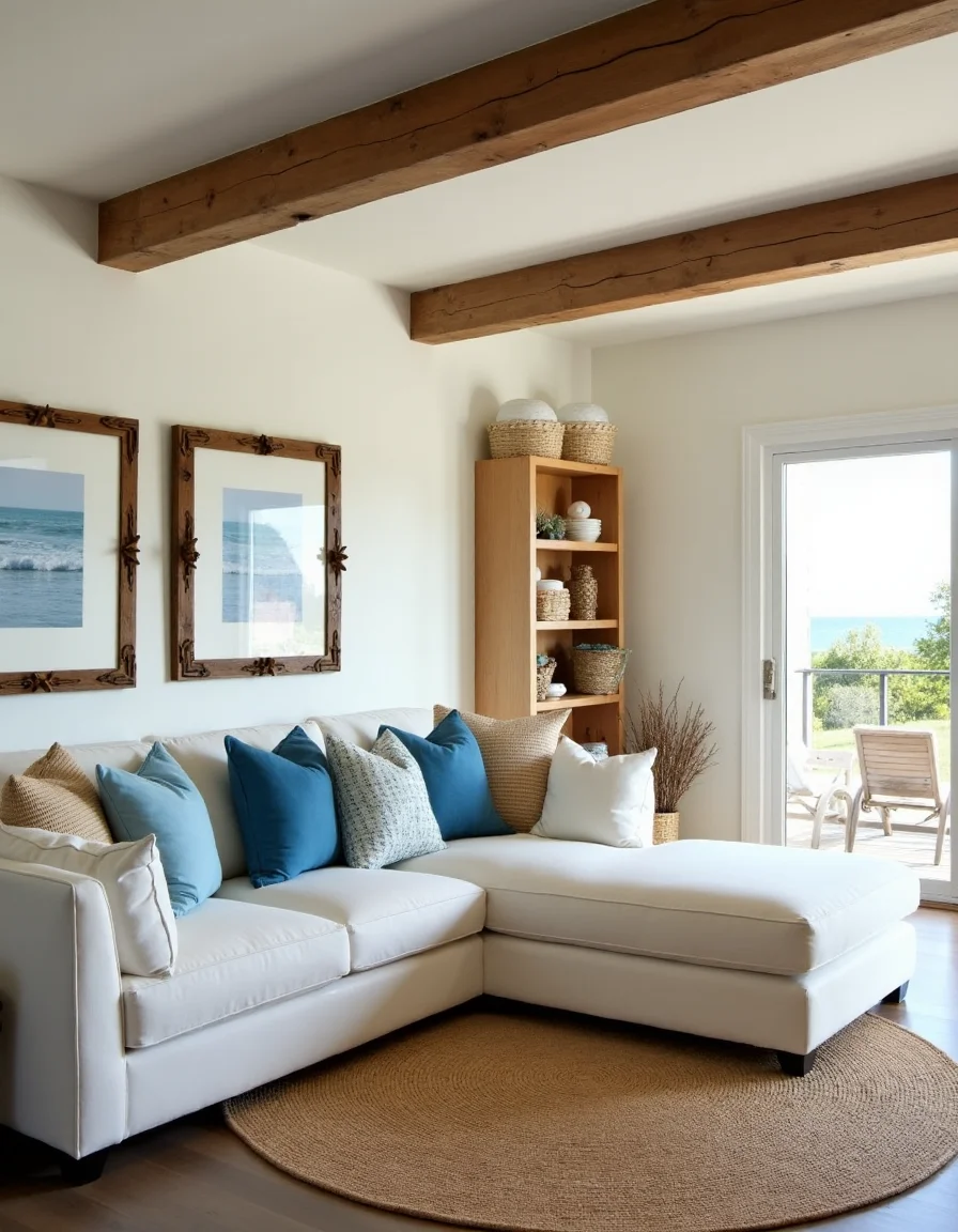 This inviting seaside living room evokes a calming beach atmosphere, highlighted by rustic wooden beams that sprawl across the ceiling, showcasing their natural grain. A large, plush white sectional couch is positioned at the center of the space, adorned with an assortment of soft, blue and sandy beige throw pillows that mimic the colors of the shore. On the walls, artwork featuring serene ocean landscapes framed in driftwood brings elements of nature indoors, while woven baskets filled with seashells and coastal knick-knacks sit casually in a light oak bookshelf nearby. To complete the look, a round jute area rug anchors the seating area, and a large sliding glass door opens out to a sunlit deck, blending the indoor and outdoor spaces seamlessly and flooding the room with natural light.