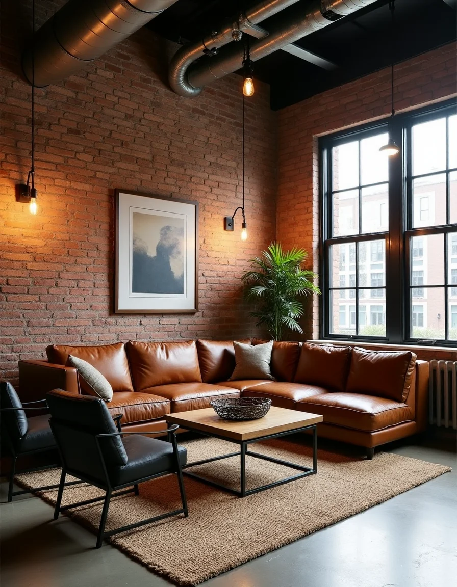 The living room boasts an industrial style characterized by its exposed burnt brick walls that create a warm yet rugged ambiance, contrasting beautifully with the sleek, modern ceiling windows that flood the space with natural light. In the center, a large, distressed leather sectional couch in deep whiskey tones invites relaxation, while two vintage metal side chairs, finished in matte black, are strategically placed around a reclaimed wood coffee table. The room also features a large area rug woven with earthy tones, grounding the space while adding coziness. Industrial chic light fixtures, including pendant lights with Edison bulbs, hang from a high ceiling adorned with exposed pipes, enhancing the overall urban character of the room.