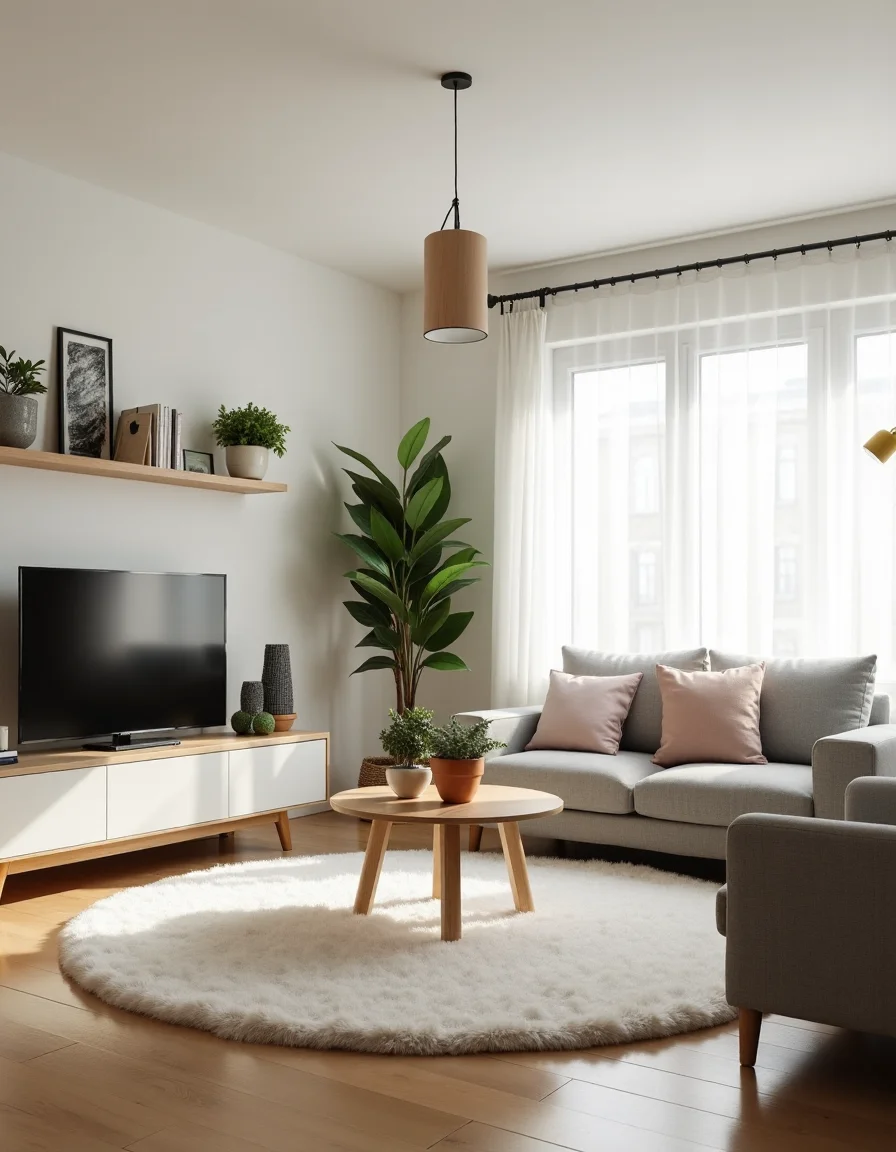 The living room embodies a Scandinavian style, characterized by bright and pale tones with an emphasis on natural light. A large fluffy white area rug anchors the space, while a light oak coffee table sits at the center, surrounded by a pair of minimalist gray fabric sofas adorned with soft pastel-colored cushions. Against one wall, a sleek pale wood media console displays an assortment of potted greenery, including a tall snake plant and delicate succulents that bring life to the room, while adding warmth. A large window dressed in sheer white curtains bathes the room in natural light, complemented by hanging pendant lights with simple designs that exude a cozy ambiance. Finally, a set of floating wooden shelves curated with books and tasteful decor pieces enhances the aesthetic by utilizing vertical space without overcrowding the area.