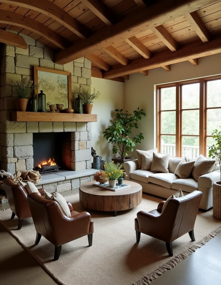 This rustic living room exudes warmth and charm, with exposed wooden beams gracing the ceiling and reclaimed barn wood accents on the walls. A large stone fireplace anchors one side of the room, its mantel adorned with vintage metal lanterns and wildflower arrangements in earthenware pots. A plush, oversized sectional sofa in soft, muted earth tones is layered with various textured throw blankets and a collection of handwoven cushions, adding comfort and interest. A distressed, round coffee table made from reclaimed wood sits in front, surrounded by several aged leather armchairs for inviting conversation, while a hand-knotted wool rug in inviting shades of cream and brown defines the space. Finally, potted greenery in rustic woven baskets adds life, where large windows let in ample natural light, creating a cozy, inviting atmosphere.