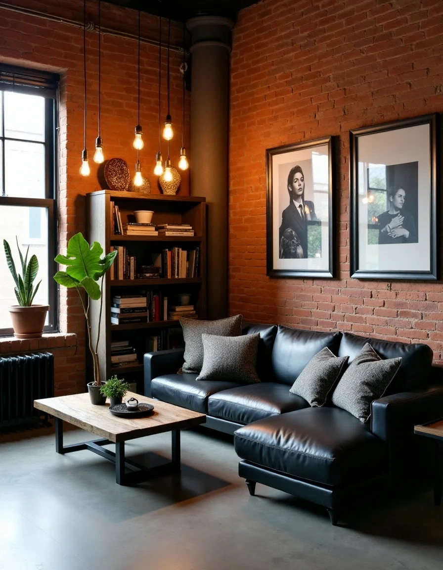 This industrial-style living room exudes a raw and rustic charm, characterized by exposed brick walls in a deep burnt orange hue that contrasts beautifully with the rich charcoal gray of the concrete flooring. A large black leather sectional sofa sits in the center of the room, adorned with textured throw pillows in varying shades of gray and black, inviting relaxation. Overhead, a series of Edison bulb pendant lights dangles from steel cables, casting a warm glow and complementing the sleek metal coffee table that features a distressed wooden top and rugged iron legs. The space is enhanced by industrial décor elements, including a reclaimed wood bookshelf filled with an eclectic mix of books and vintage items, and wall art comprised of black-and-white photography displayed in simple black frames that add a contemporary touch. A few strategically placed greenery elements, such as a tall potted snake plant and smaller succulents on the windowsill, provide a breath of fresh air and soften the industrial edge.