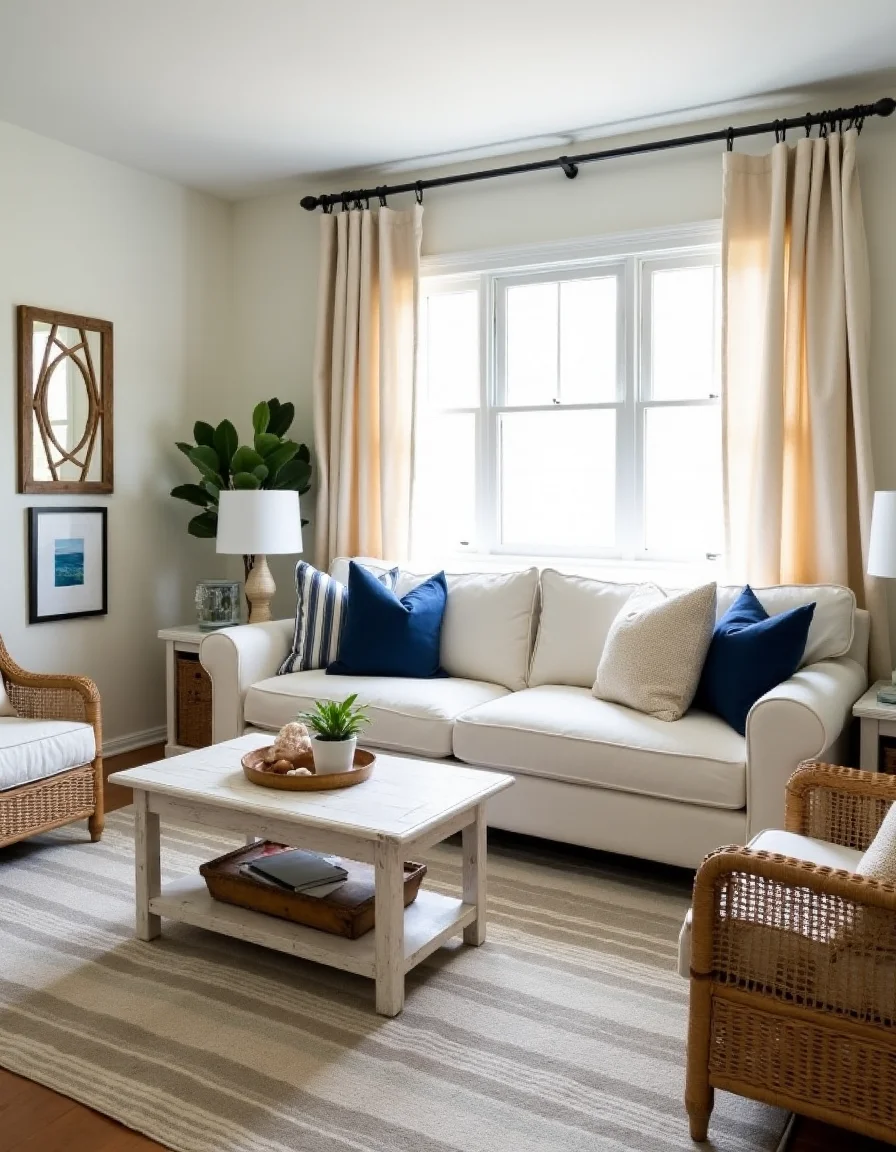 The living room is a serene seaside retreat, adorned with soft hues of ocean blue and sandy beige. A plush, light cream-colored sectional sofa sits in the center, accented with pillows featuring nautical stripes in navy and white. Underfoot lies a large, beige striped carpet that evokes the feel of sun-bleached shores, while light sheer curtains flutter softly at the window, allowing gentle sunlight to filter through. A rustic whitewashed coffee table, topped with a collection of seashells and a potted succulent, complements the beachy vibe, while two wicker armchairs draped with cozy pastel throw blankets flank either side. On the walls, framed prints of coastal scenes and a driftwood mirror reflect the room's airy atmosphere, completing the tranquil escape.