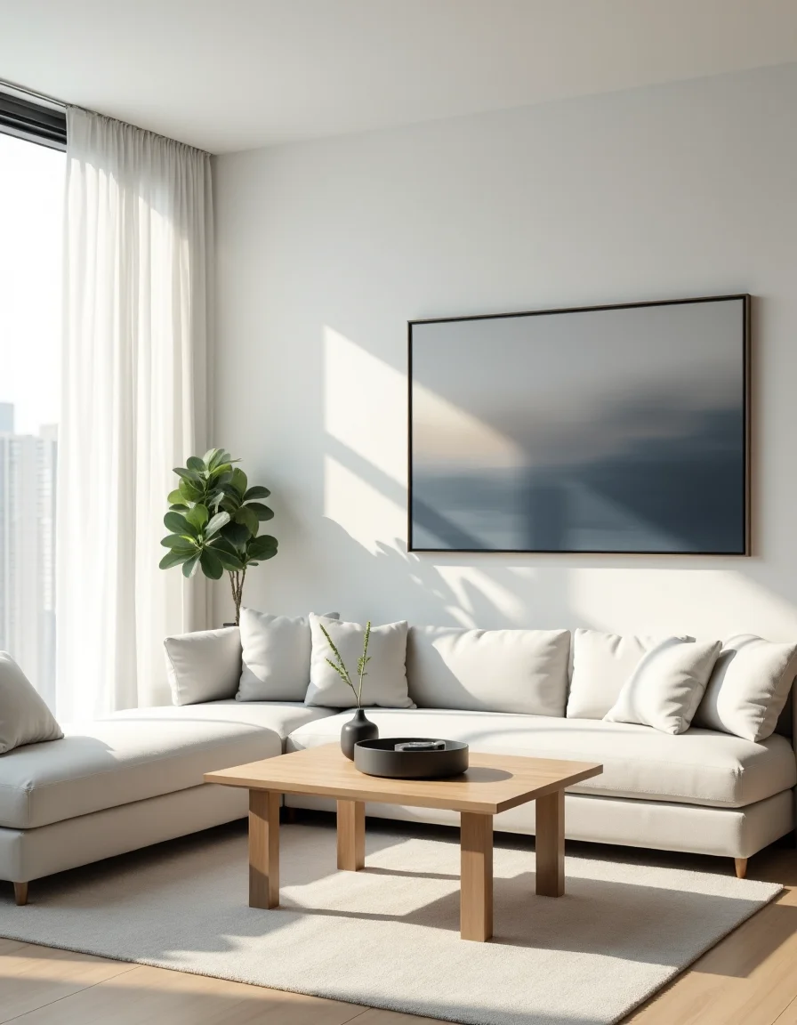 This minimalist living room embodies a serene and uncluttered atmosphere with a refined color palette of soft whites, muted grays, and natural wooden tones. A sleek white sectional sofa is positioned facing a simple yet elegant coffee table made of light oak, enhancing the room's airy feel. To maintain a sense of openness, a large abstract painting in grays and blues is hung on the wall, drawing attention without overwhelming the space. Floor-to-ceiling windows bathe the room in natural light, while sheer white curtains delicately filter sunlight, emphasizing the clean lines of the decor. A single leafy plant in a minimalist pot sits in the corner, adding a touch of nature and softening the otherwise stark environment.