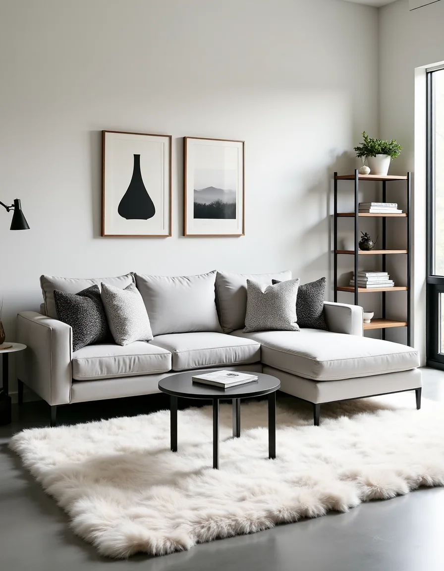 This modern living room exudes simplicity and a touch of industrial charm, highlighted by a neutral color palette of soft grays and whites. A large sectional sofa in a light gray fabric is centered on a plush, white faux fur area rug, positioned on the sleek, polished concrete floor. A minimalist coffee table with a glass top and brushed steel legs anchors the seating area, while geometric patterned throw pillows add a touch of sophistication. On the walls, abstract black-and-white art pieces hang, complementing the aesthetic, with a single potted succulent positioned on a corner shelf, bringing a hint of greenery into the otherwise muted space. A multi-functional shelving unit made of black metal and natural wood displays curated décor pieces and books, enhancing the room’s clean lines and open feel.