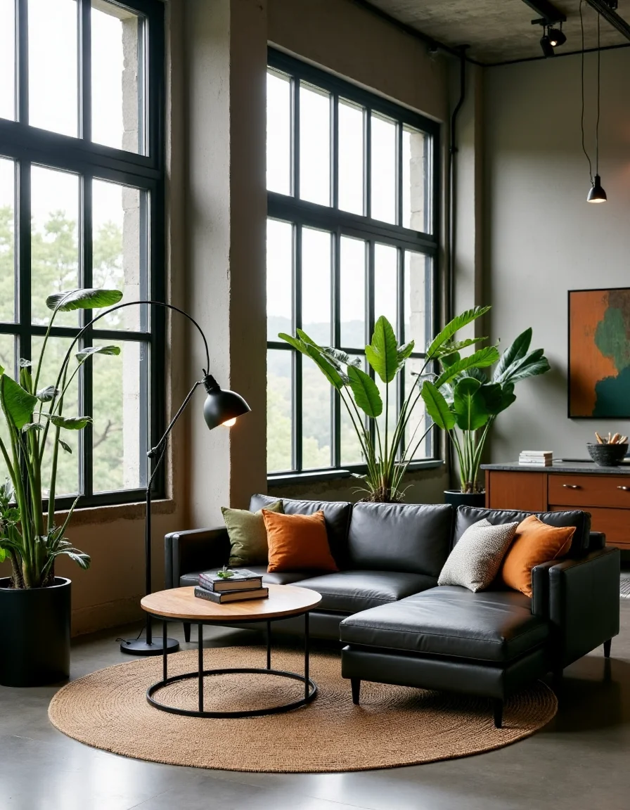 The living room embodies an industrial style, with soaring ceiling windows that flood the space with natural light, emphasizing the raw concrete walls and exposed steel beams. A deep charcoal leather sectional sofa sits at the center, adorned with mismatched throw pillows in muted earthy tones of olive green and rust, adding warmth to the cool materials. To complement the space, a reclaimed wood coffee table with metal accents rests on a woven jute area rug, bringing texture and comfort. Alongside, an oversized vintage metal floor lamp with an Edison bulb creates a cozy reading nook, while large potted plants in matte black pots punctuate the room, adding a touch of nature amidst the industrial backdrop.