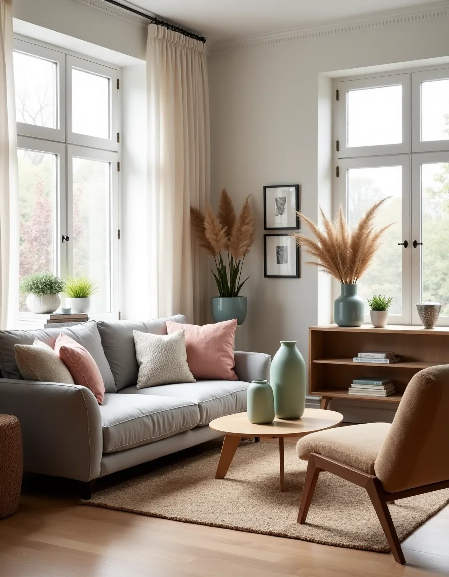 The living room is a serene Scandinavian oasis, featuring soft white walls and large windows draped with sheer, cream-colored curtains that invite natural light to spill onto the warm, light oak flooring. In one corner, a plush, gray sectional sofa with rounded edges is adorned with various textured throw pillows in muted pastels like blush pink, soft mint, and dove gray, complementing the cozy yet practical ambiance. A simple, Scandinavian-style coffee table made from light wood presents two decorative ceramic vases filled with pampas grass, further enhancing the homey and tranquil vibe. On the opposite wall, a sleek, minimalist bookshelf displays an array of books, indoor plants, and subtle decor items, while an inviting armchair upholstered in warm beige is tucked beside a small, handwoven jute rug that adds a tactile element beneath the coffee table, creating a warm, layered space for relaxation and social gatherings.