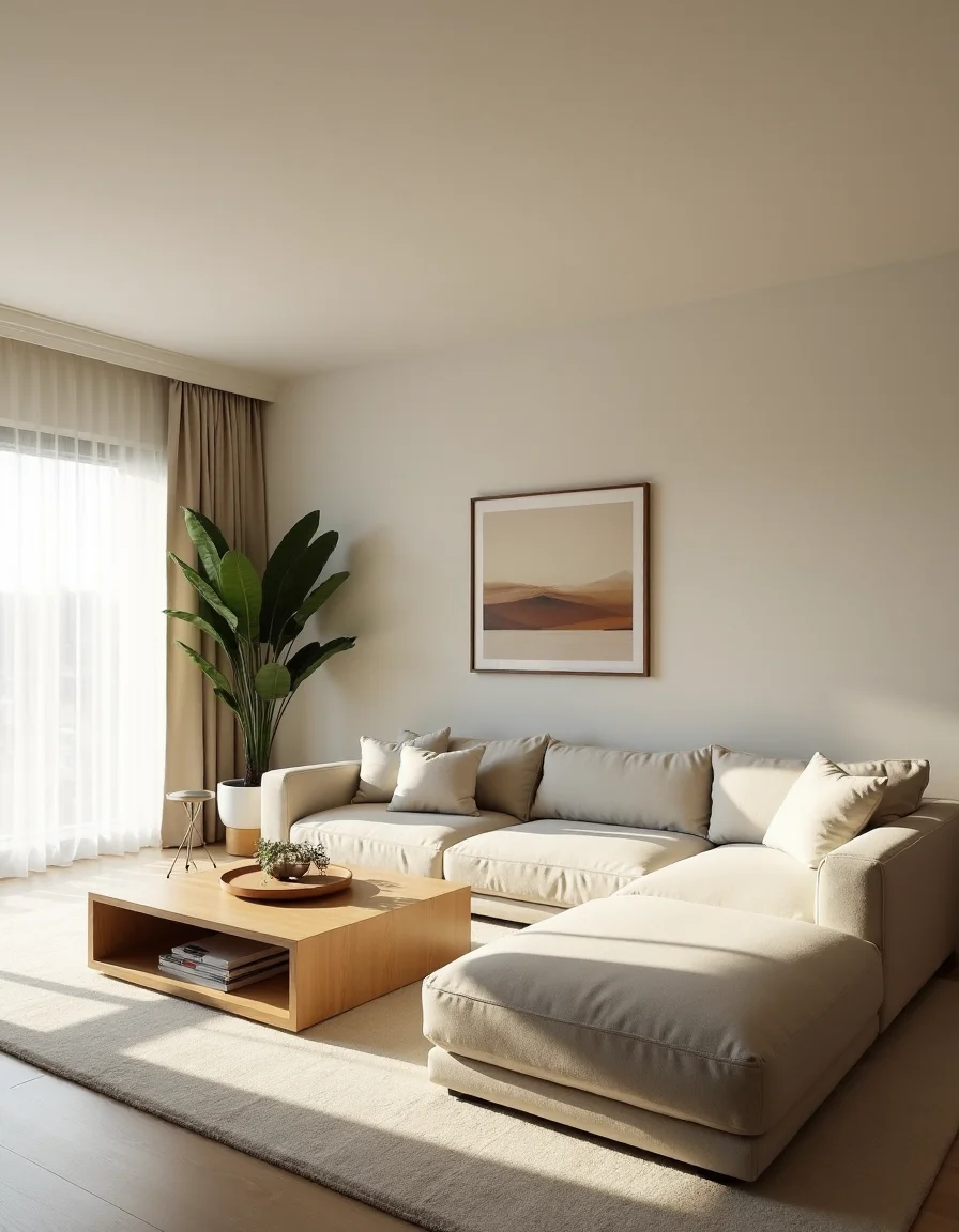 The living room showcases a minimalist style characterized by an open and uncluttered layout. Dominating the space is a sleek, low-profile sectional sofa upholstered in soft, light grey fabric, adorned with a few strategically placed fluffy white throw pillows. A low, rectangular coffee table made from natural oak sits at the center, flanked by two small metallic side tables, echoing the understated elegance of the room. The walls are painted a warm ivory, providing a serene backdrop for a single piece of abstract wall art featuring subtle earth tones, which hangs above the sofa. In one corner, a tall potted snake plant adds a touch of greenery, complementing the neutral palette while large sheer curtains filter in soft afternoon light, creating a calming ambiance throughout the space.