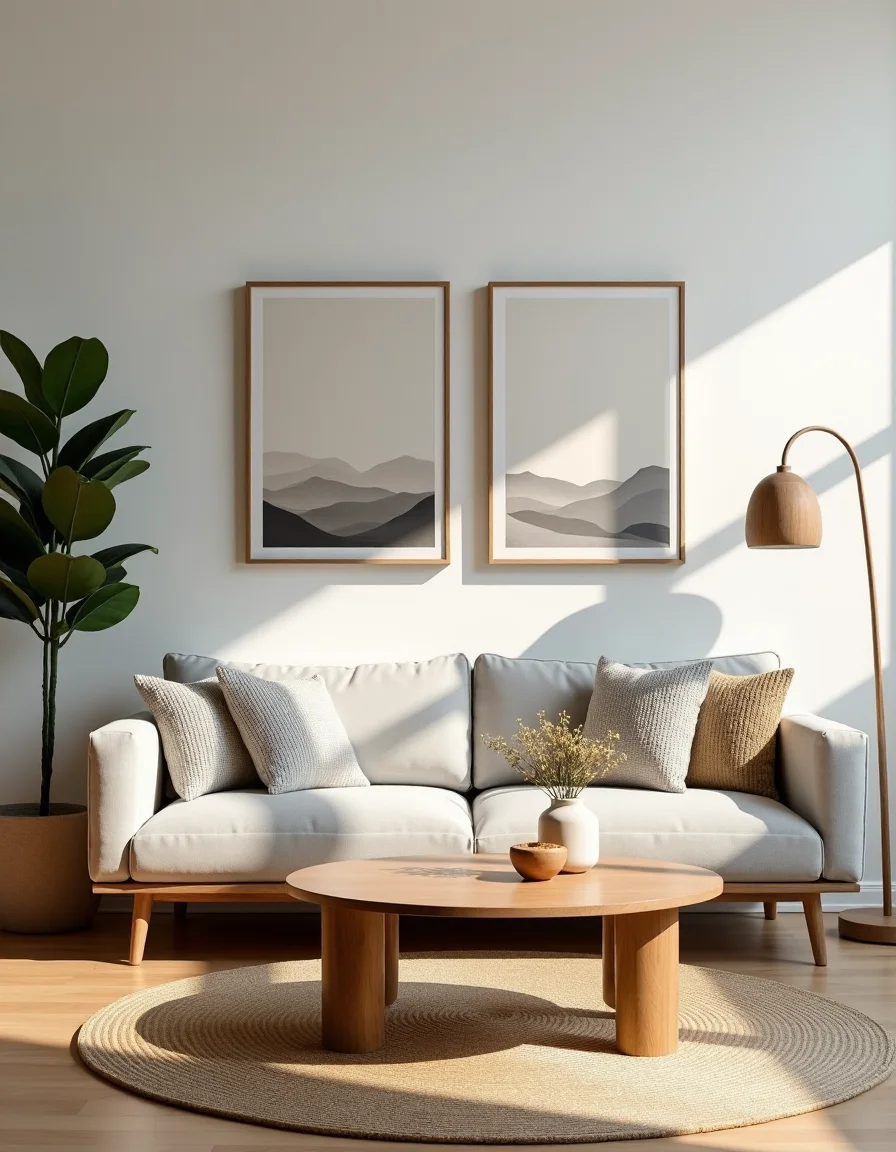 The living room is a serene Scandinavian-inspired sanctuary characterized by pale tones of soft whites and muted grays that envelop the space. A large, plush, light gray sofa adorned with cozy, knitted throw pillows sits at the center, accompanied by a simple yet stylish light wood coffee table that features a labyrinth of sleek lines. In the corner, a tall potted fiddle leaf fig plant adds a vibrant touch of greenery, while minimalist art featuring abstract landscapes graces the walls, framed in natural oak. A woven jute area rug underfoot brings warmth and texture, and soft, ambient lighting emanates from a hand-crafted floor lamp with a wooden base, giving the room a welcoming glow. Accessories such as ceramic vases with delicate wildflowers are present throughout, contributing to an overarching sense of tranquility and effortless charm.