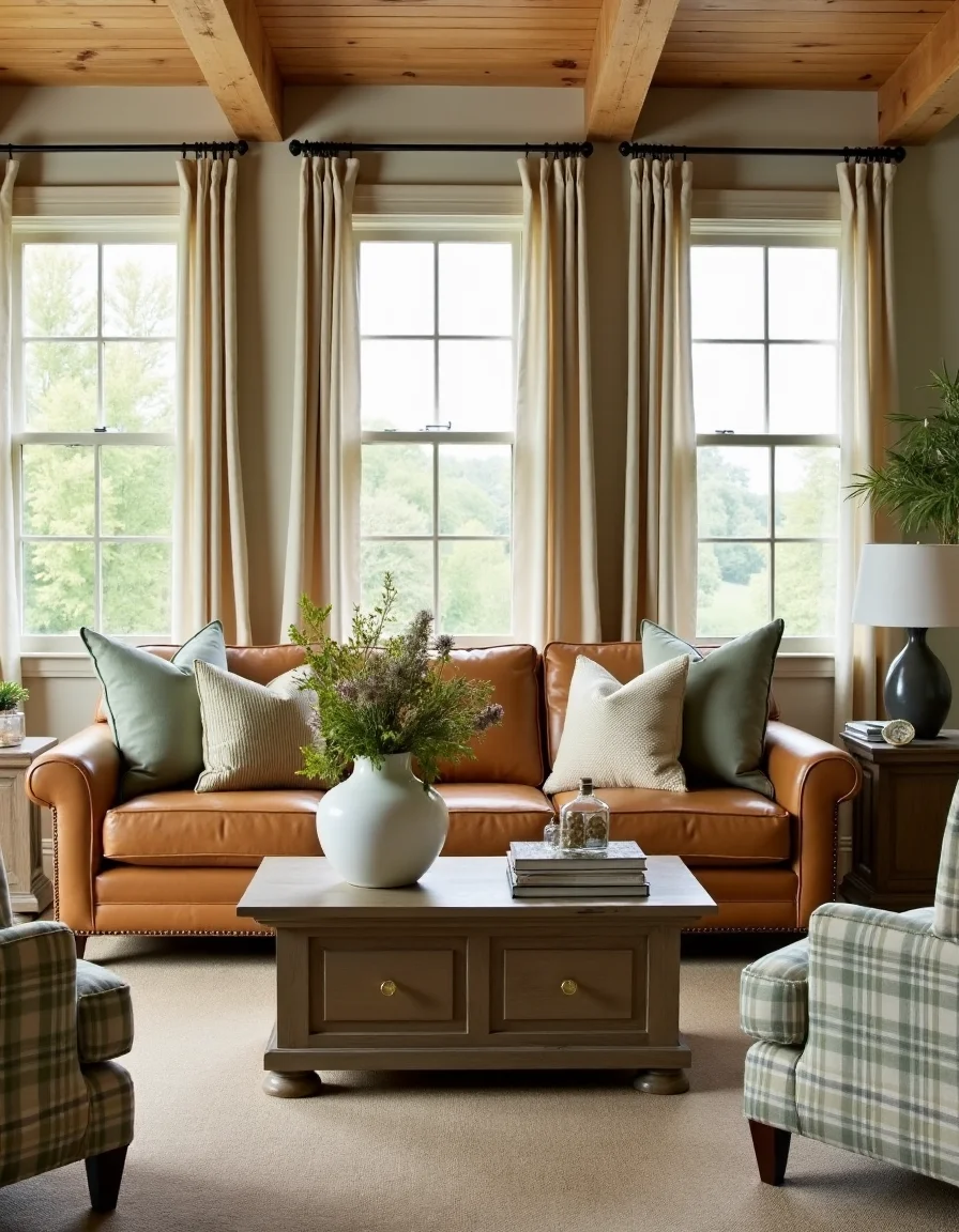 This charming country living room features a warm, inviting atmosphere rooted in earthy tones and soft neutrals. A large, rustic leather sofa in a gentle tan hue is center stage, adorned with an array of textured throw pillows in shades of cream and sage green. In front of the sofa, an old barn wood coffee table holds a large, white ceramic vase filled with fresh wildflowers. Flanking the sofa, two cozy armchairs in a muted plaid pattern provide additional seating, and a plush area rug in soft beige anchors the space. Natural light filters in through sheer linen curtains, accentuating the warm, wooden beams of the ceiling and enhancing the overall cozy and grounded ambience of the room.