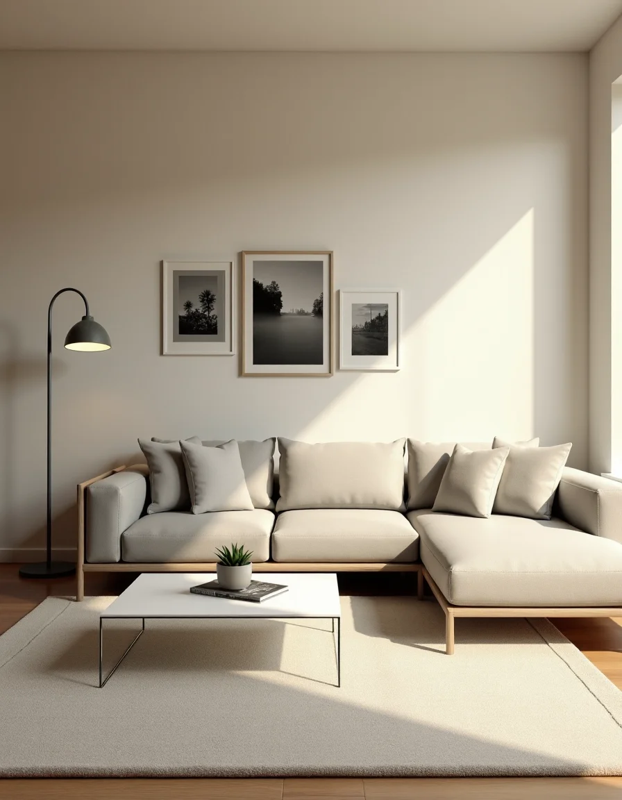 The living room embraces a minimalist ethos with its streamlined design and serene ambiance. The focal point is a low-profile, light gray sectional sofa, adorned with a few monochromatic cushion covers that blend seamlessly with the space. A simple, square white coffee table made of clear glass rests atop a soft, textured area rug in a subtle cream shade, while a single potted succulent positioned on its edge adds a touch of organic life. The walls are painted in a warm beige, allowing natural light to accentuate the minimal decor, which includes a scattering of framed black and white photographs and a stylish floor lamp with a sleek, arched design casting a gentle glow in the evening hours.