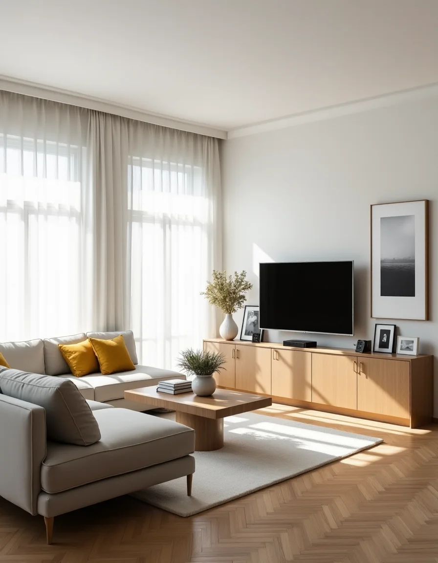 The living room features an open, airy layout with a soft color palette of whites, light grays, and earthy tones. A plush, light-gray sectional sofa sits against the wall, adorned with a couple of mustard-yellow throw pillows for a pop of color. In front of the sofa, a minimalist wooden coffee table crafted from oak holds a few chunky books and a small, elegant ceramic vase filled with fresh greenery. A sleek, asymmetrical media console made of light wood with closed cabinets is positioned across from the seating area, topped with a slim-profile flat-screen TV and some decorative items like framed black-and-white photos and a contemporary clock. Large windows dressed in sheer white curtains allow natural light to flood in, illuminating the beautiful herringbone-patterned hardwood floor, enhancing the perception of space and simplicity.