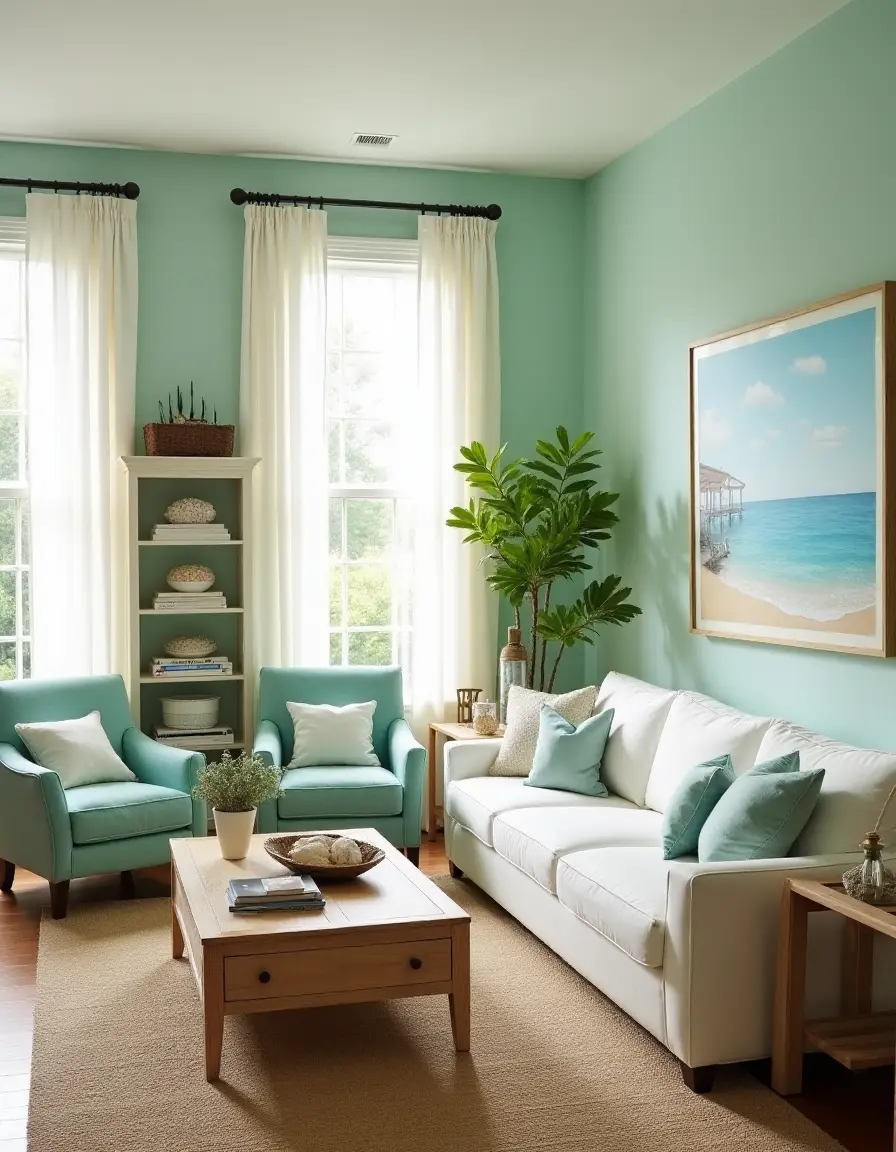 This seaside-inspired living room exudes a calming ambiance characterized by plush seating and an inviting white, oversized sectional couch that anchors the space in the center. Complementing the couch, two soft aqua armchairs are placed at an angle, inviting conversation while a light hardwood coffee table sits atop a woven jute rug, bringing an organic touch. The walls are painted in a soft seafoam green, adorned with coastal-themed artwork depicting serene ocean scenes, while natural light pours through sheer, white linen drapes that frame large bay windows. Shelving on either side of a whitewashed media console is filled with decorative nautical elements, seashells, and potted greenery, enhancing the room's airy feel and creating a seamless flow between indoor and outdoor living.