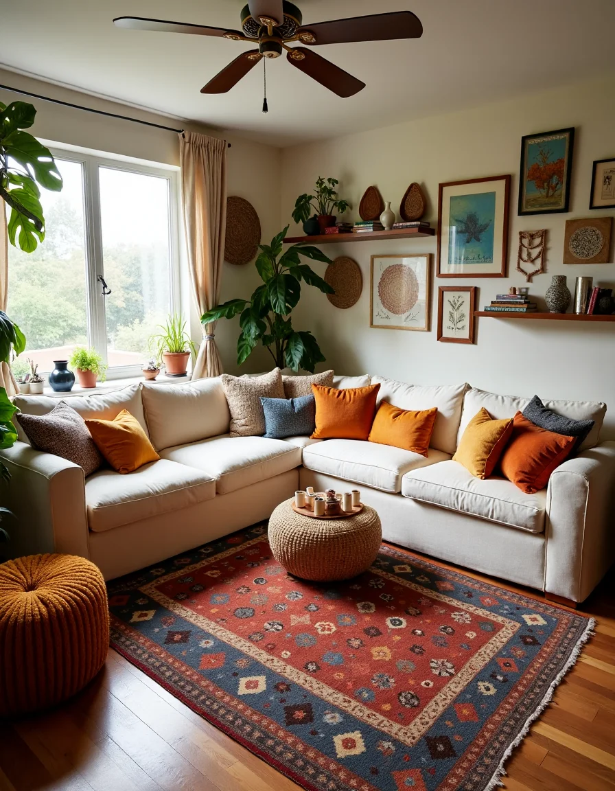 This cozy bohemian living room is adorned with an eclectic mix of furniture and vibrant decor, creating a warm and welcoming ambiance. A plush, oversized, cream-colored sectional sofa, covered with an array of colorful throw pillows in various patterns, occupies the center of the room, complemented by a textured rust-colored pouf. Beneath the sofa, a large patterned kilim rug featuring earthy tones of terracotta, deep blue, and mustard yellow adds depth and character to the space. Lush potted plants, including a tall fiddle leaf fig and cascading pothos, bring life into the room, strategically placed near a wooden corner shelf filled with books and unique trinkets. A gallery wall, showcasing an assortment of framed art pieces and woven wall hangings, enhances the bohemian vibe while a rattan coffee table sits at the center, adorned with candles and artisan pottery, creating an inviting atmosphere perfect for relaxation and social gatherings.