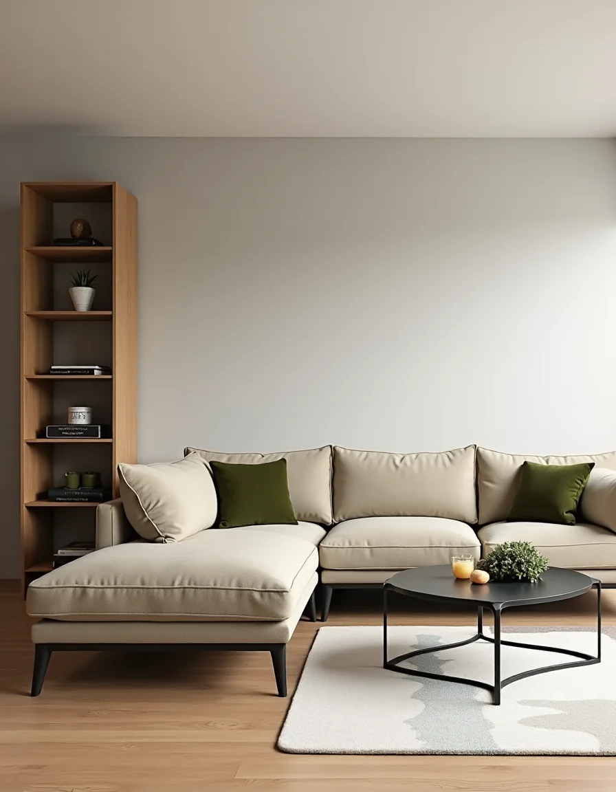 The living room embodies a minimalist style with its clean lines and uncluttered space. A low-profile, beige sectional sofa features sleek modular cushions, perfectly accented by a single-cut velvet throw pillow in an earthy sage green. A multi-functional coffee table sits at the center, crafted from matte black metal with a glass top, capable of transforming into a dining surface. In the corner, a tall, minimalist bookshelf made of natural wood showcases carefully curated decor items, including a few potted succulents and art books, emphasizing durability and longevity. The neutral light gray walls contrast beautifully with the warm wooden floors, while a simple abstract rug in soft white and muted hues ties the room together, creating an inviting yet sophisticated ambiance.