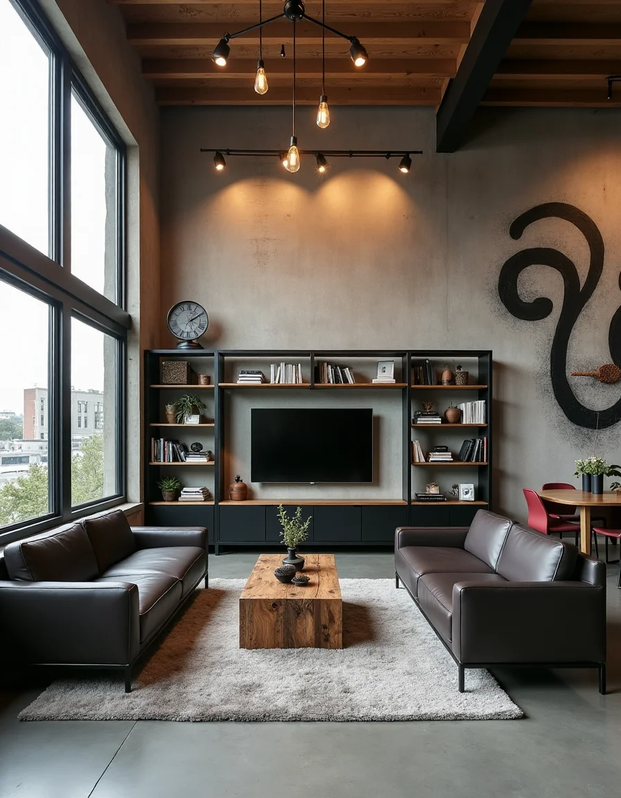 This industrial-style living room features an open layout with soaring ceiling windows that illuminate the space with natural light, highlighting the rugged beauty of exposed concrete walls. The flooring is a refined polished concrete, accentuated by a large, plush area rug in a muted grey that softens the room's hard edges. A pair of modern leather sofas in deep charcoal flanks a low, rustic wood coffee table, crafted from reclaimed barn wood, its unfinished edges contributing to the room's raw aesthetic. Steel shelving units adorn the walls, showcasing an eclectic mix of books and artisanal decor, while a striking abstract mural in black and white adds an artistic flair to one side, further emphasizing the industrial spirit of the space. Edison bulb pendant lights hang from the ceiling beams, casting a warm glow and creating a cozy yet sophisticated ambiance.