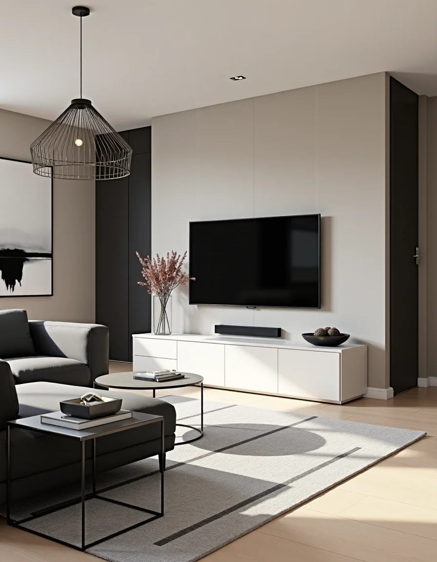 The living room embodies a sophisticated modern aesthetic, characterized by a largely neutral color palette of soft greys and whites. The walls are adorned with textured, matte finishes that lend a contemporary feel, while a sleek sectional sofa in charcoal fabric is positioned centrally, flanked by minimalist glass side tables that provide an airy elegance. Across from the seating area, a low-profile media console in polished white finish is mounted underneath a large wall-mounted television, complemented by a striking abstract painting in monochrome tones above it. The room is illuminated by a stylish pendant light fixture with geometric lines, casting soft rays onto a plush area rug with a subtle geometric pattern, enhancing the overall clean and uncluttered appearance.