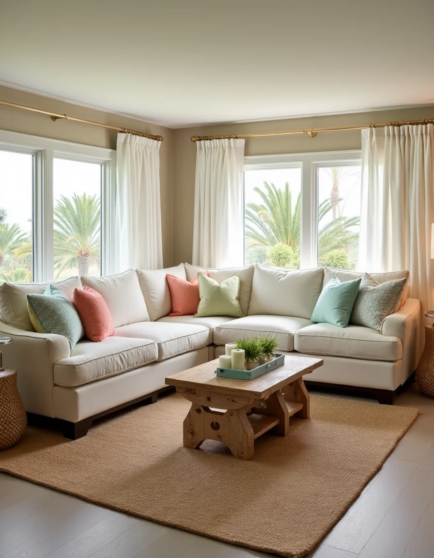 The living room exudes a relaxed seaside vibe, highlighted by the soft hues of sandy beige walls that complement the light taupe hardwood flooring. A spacious L-shaped sectional sofa, upholstered in a textured cream fabric, is adorned with seafoam green and coral patterned throw pillows, offering both comfort and style. A large jute area rug anchors the seating area, while sheer white curtains billow gently in the ocean breeze at expansive windows framing a view of palm trees swaying outside. Adding to the coastal charm, a rustic driftwood coffee table sits at the heart of the room, surrounded by two simple woven accent chairs and decorated with shells and candles in pastel colors, creating a quaint and inviting atmosphere filled with natural light.