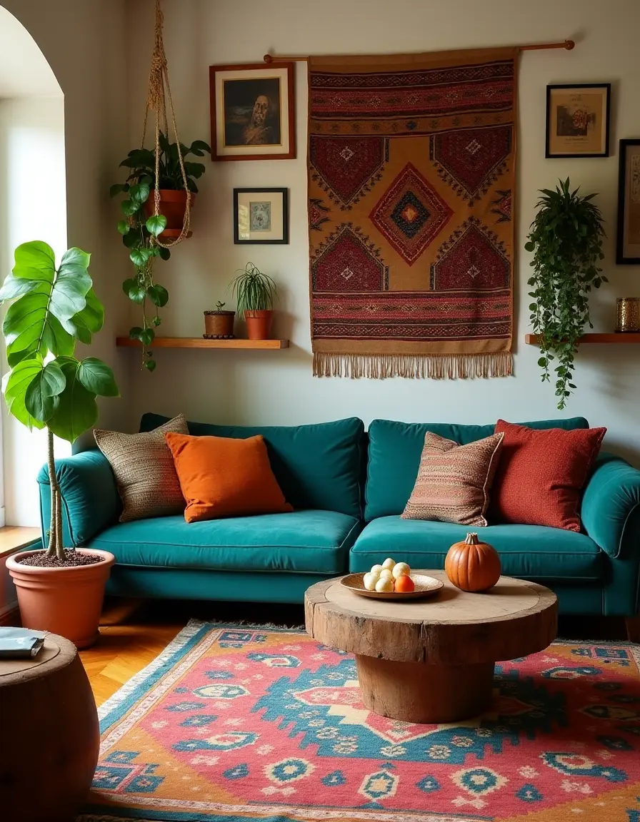 The living room exudes a cheerful bohemian vibe with its warm earth tones and vibrant splashes of color. A plush teal sectional sofa is adorned with an array of patterned throw pillows in shades of orange, burgundy, and turquoise, inviting relaxation. In one corner, a tall indoor plant, like a fiddle leaf fig, reaches toward the ceiling, while hanging macramé planters with trailing pothos add an organic touch throughout the space. A low, rustic wooden coffee table is beautifully offset by a patchwork area rug, showcasing intricate designs. Ethnic wall tapestries in browns and deep reds drape across the walls, featuring traditional patterns that tie the entire room together, while framed photography of distant lands and cultural artifacts adorn the shelves, creating an eclectic yet harmonious atmosphere.